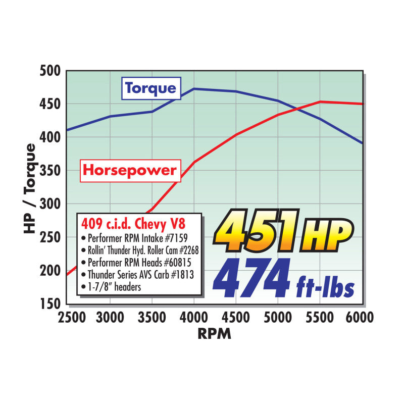 Edelbrock Rollin' Thunder Camshaft #2268 is designed for 348/409 (W Series) engines from 1958-65 and produce optimum torque from the low-end to the mid-range. Rollin' Thunder camshafts match with Performer manifolds for vehicles operating from off-idle to 5500 rpm. They are smooth idling cams for daily drivers, trucks, vans, RVs and 4x4s. You can expect a major improvement in throttle response and torque. In the manifold section you'll find torque graphs showing the power gains from Performer manifolds and Performer-Plus cams. All camshafts include flat tappet lifters (except for cams designed for use with stock roller lifters), assembly lube and instructions. This cam produced 451HP and 470 Ft Lbs of Torque when paired with Performer RPM intake manifold #7159, Performer Series Carbs #1412, Performer RPM cylinder heads #60815 and Edelbrock roller tappet lifter set #97423. Must use a high stall torque converter. Camshaft specifications: - Intake duration: 230 Degrees - Exhaust duration: 234 Degrees - Intake lift: .616" - Exhaust lift: .628" - Lobe separation: 112 Degree - Intake Center Line: 107 - Vacuum: 10"