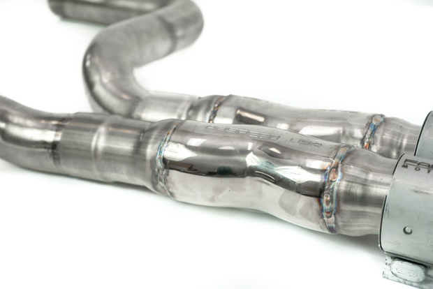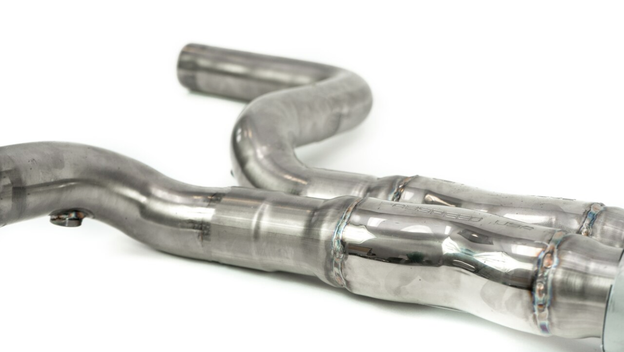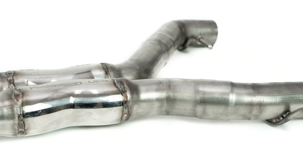 We're proud to have designed and built in-house an effective way to increase sound and performance while reducing weight with our Velar Street Exhaust System. The free-flowing X-Pipe replaces the factory mid-pipes and resonators to improve exhaust flow, increase power, and enhance the exhaust note while the high performance catted downpipes replace the restrictive primary factory catalysts with high flowing HJS German imported 200-cell catalytic converters further improving exhaust flow, performance, and sound.