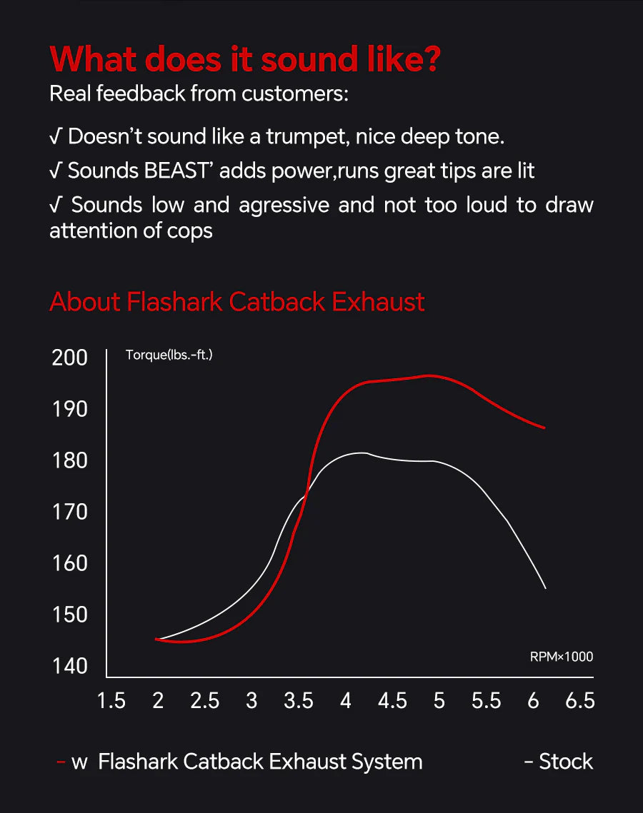 Upgrading to a 2004-2008 Ford F150 catback exhaust offers several performance and aesthetic benefits. This system not only increases horsepower, torque, and fuel efficiency but also enhances your Ford F150 sound with a louder, more aggressive exhaust tone. It gives your vehicle a sporty, tuner-inspired aesthetic, making it stand out on the road. Increase in horsepower, torque, and MPG: The straight-through design of the catback exhaust improves engine efficiency, resulting in noticeable gains in power and fuel economy. Quality materials: Made from durable stainless steel, this catback system is built to last, offering both performance and long-term reliability. FLASHARK catback exhaust systems are made of  Stainless Steel with a fully polished surface, CNC machined flanges and mandrel bends. Its aggressive styling, and deep, strong tone are just part of the MR exhaust system characteristics. It also serves to improve horsepower, torque and overall performance with its straight-through design. Finished with a tip that is designed to increase the scavenging effect and achieve maximum performance, while adding a perfect match on exterior styling as well. It's really easy and convenient to use: direct bolt-on, no modification needed.