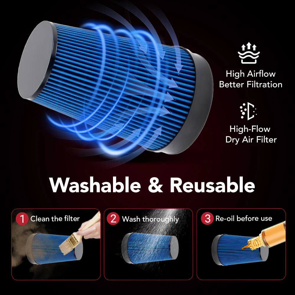 Washable, Reusable Filter The Flashark cold air intake isn’t just about performance—it’s designed for long-term convenience and savings. Washable Filter: The high-quality cone air filter can be cleaned and reused, eliminating frequent replacements. Cost-Effective: Save money on disposable filters while maintaining peak engine performance. Long-Lasting Performance: Designed to last the life of your vehicle with proper care. Maintenance Interval: Simply clean your filter every 10,000–15,000 miles to keep airflow and performance at their best. With easy maintenance and reusable components, the Flashark intake ensures your engine keeps performing at its peak while reducing ongoing costs.