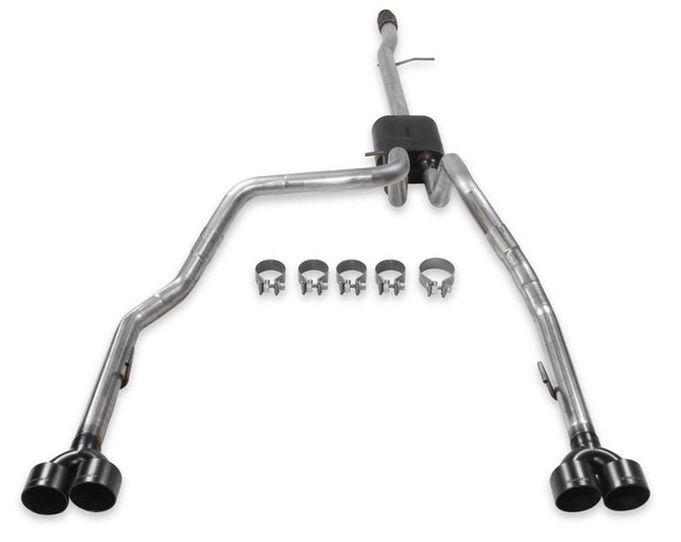 The new Flowmaster® American Thunder® cat-back exhaust system for the 2019-2021 GM 1500 (new body style) trucks with 5.3L engine is perfect for the person looking for an aggressive sound level outside the truck, with a moderate interior tone and the performance benefits you would expect from Flowmaster. This emissions-legal bolt-on system fits all Crew Cab and Double Cab models with 5.5 and 6.5-ft long beds with factory dual exhaust option. Features include flex joint, mandrel-bent 3.00-inch stainless steel tubing flowing into a Super 40® Series muffler, dual 2.50-inch mandrel-bent stainless tailpipes that are finished off with quad 4.00-inch black ceramic coated stainless steel tips exiting out under the factory exhaust bezels. Designed for an easy fit, this system includes all necessary parts and hardware for an easy at home installation. Notes: Fits 2019-2020 Chevrolet Silverado 1500 and GMC Sierra 1500 Crew Cab and Double Cab models with 5.3L engine. Fits models with 5.5 and 6.5-ft long beds with factory dual exhaust option.