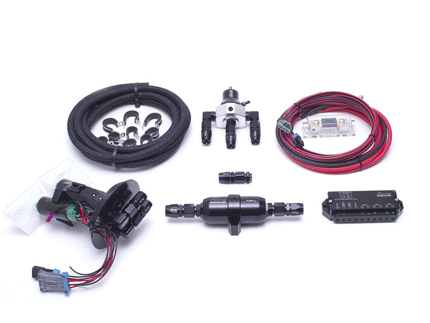800 rwhp capable return fuel system uses the factory fuel rails. The upgraded feed fuel is regulated before entering the factory fuel rails. Proper upgraded feed line and filtration included. Perfect system for applications where factory fuel rails must be used.