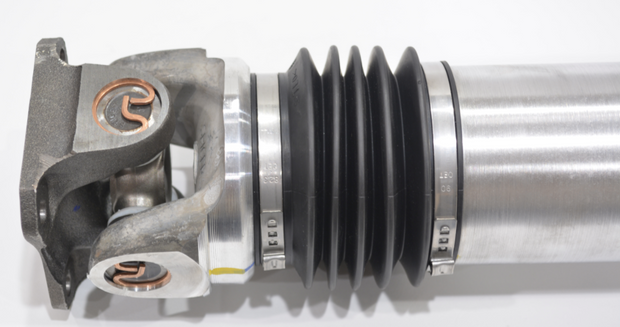 These aluminum driveshafts are designed with a tightly-fitted, inverted splined slip-assembly that lets the shaft plunge in and out but also gives the shaft stability at high RPM while maintaining unparalleled strength. The splined area comes with a boot to protect it from dust and other road debris.