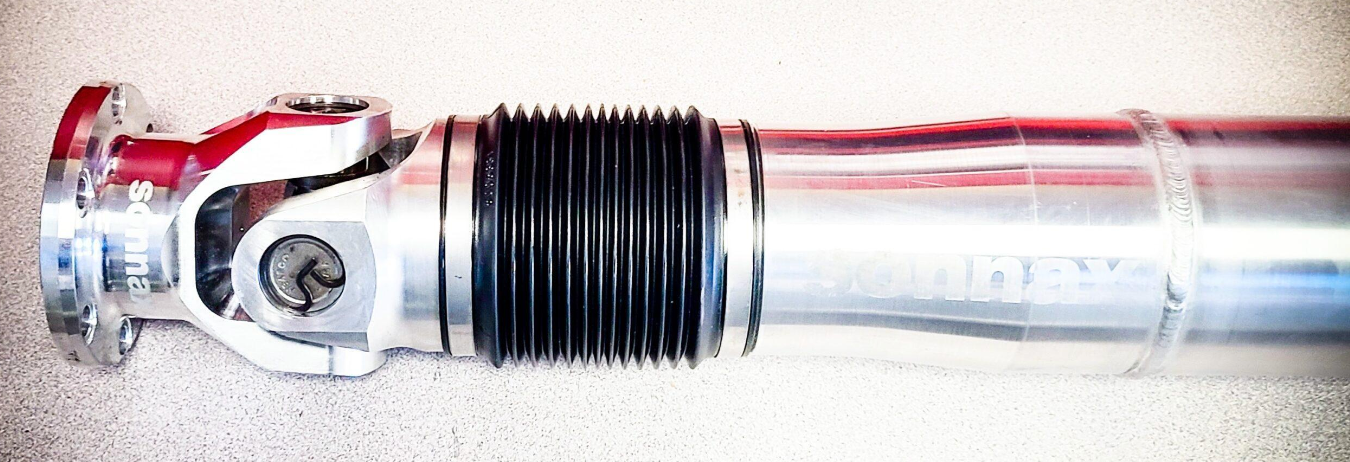 We use a 2024 aluminum bondable yoke shaft and spline sleeve assembly from Composite Drivelines for additional strength vs traditional 6061 aluminum