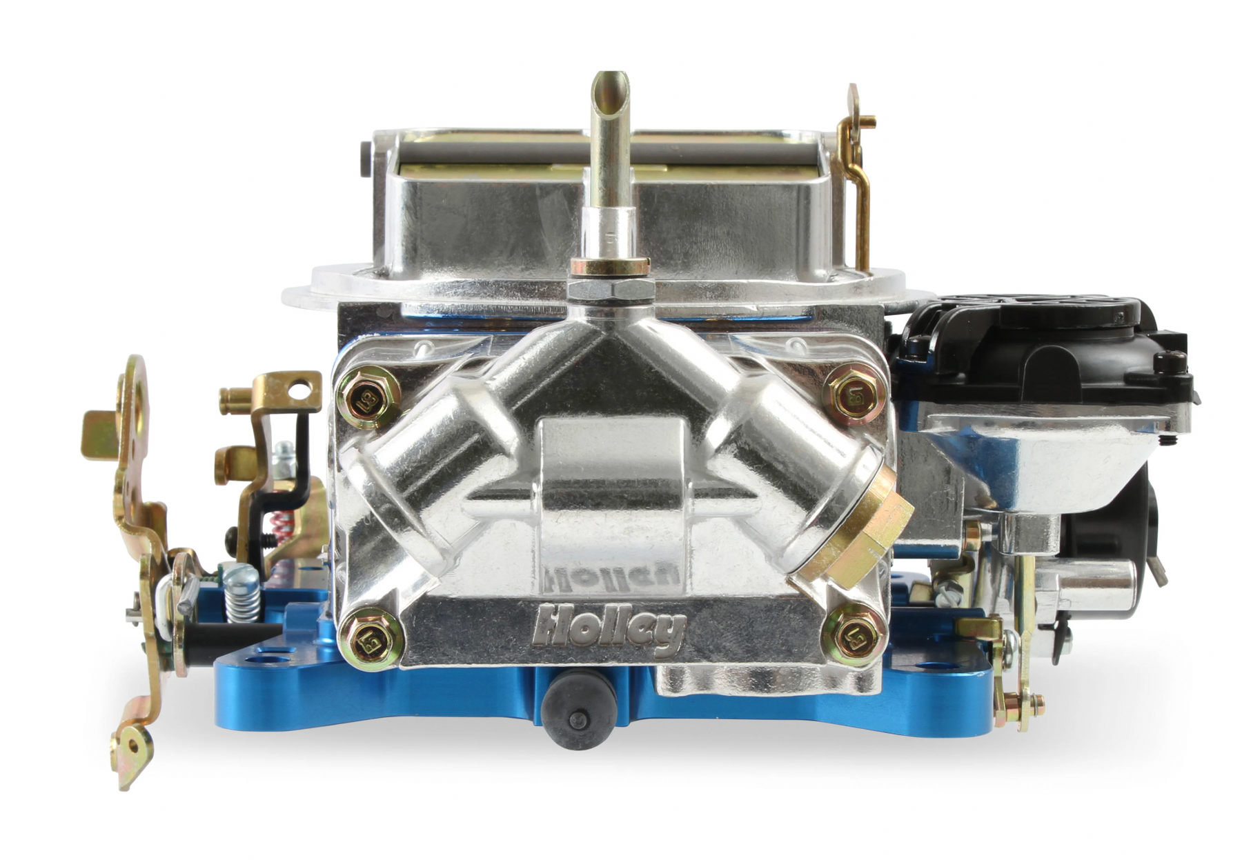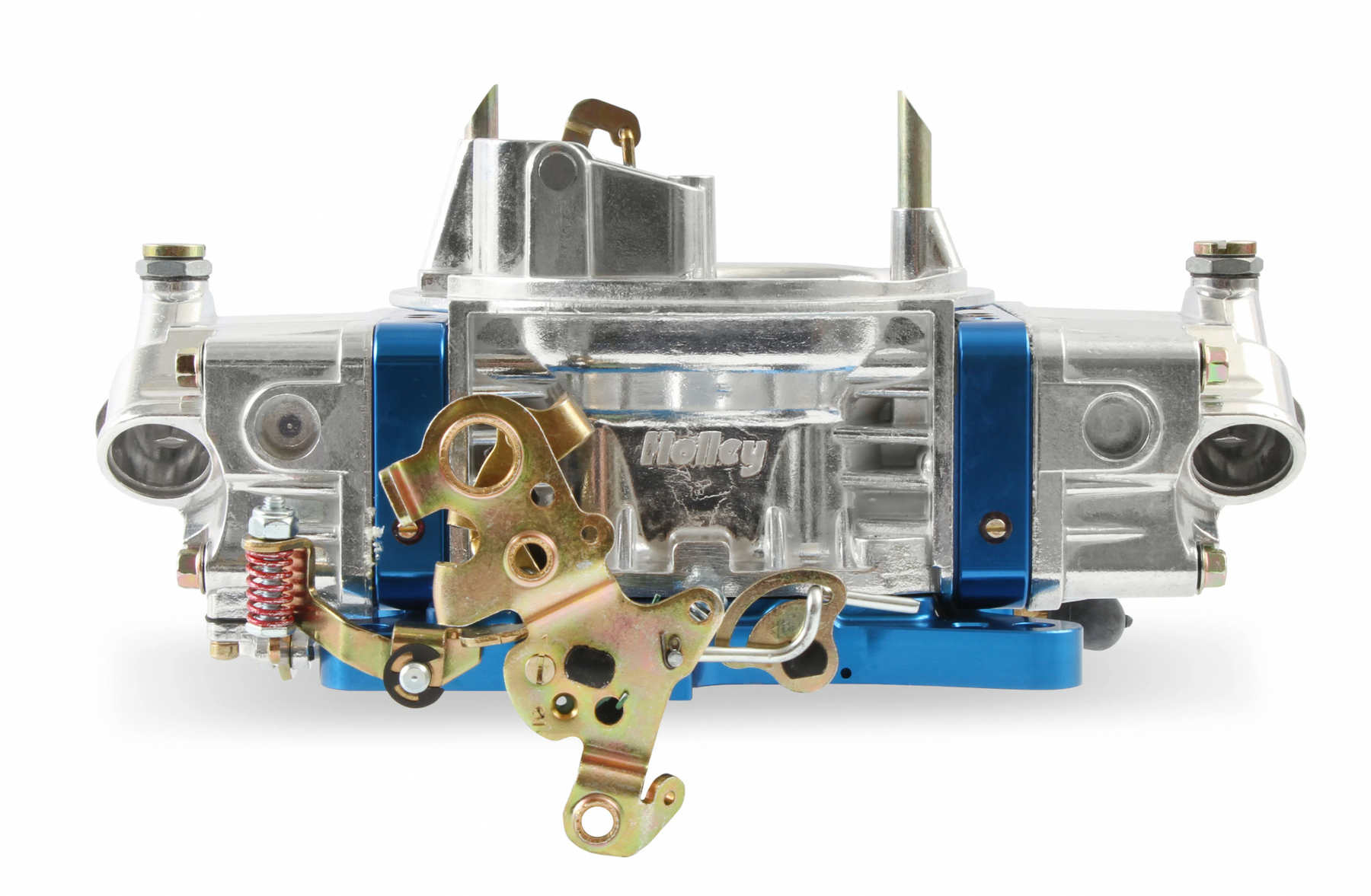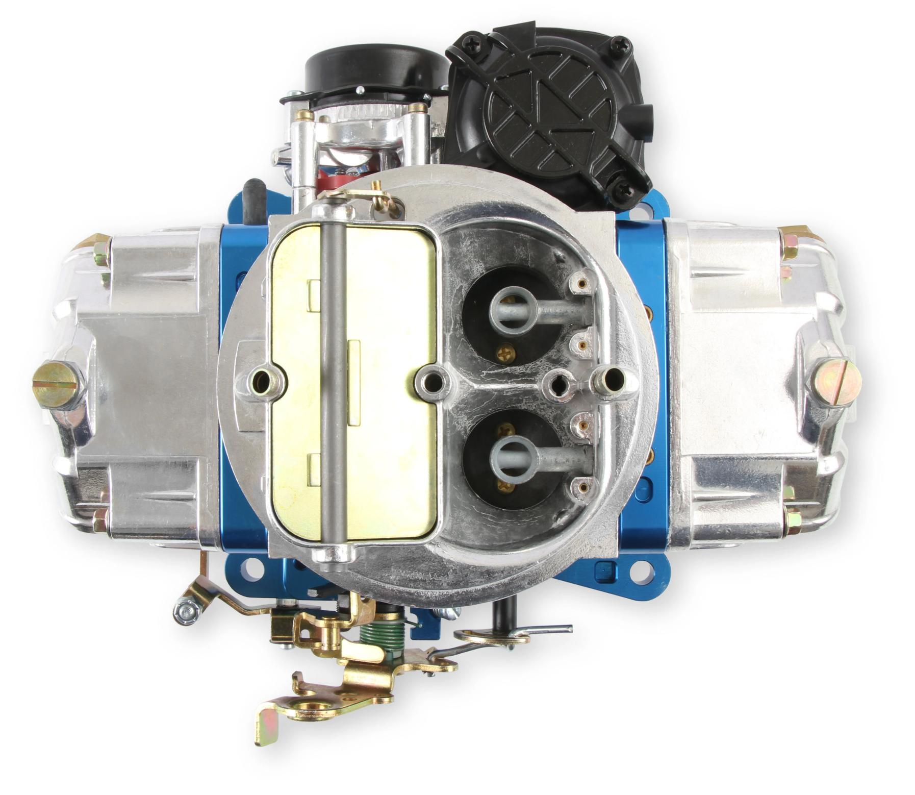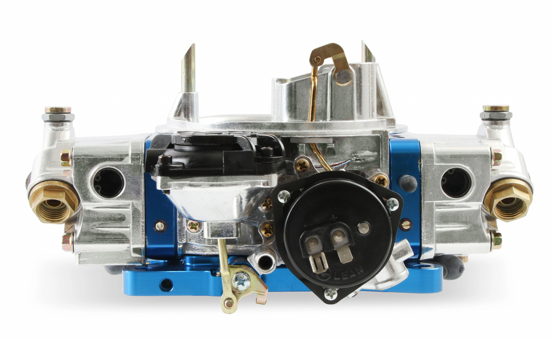 Shiny with blue anodized billet aluminum metering blocks/base plate for good looks and true gasket sealing