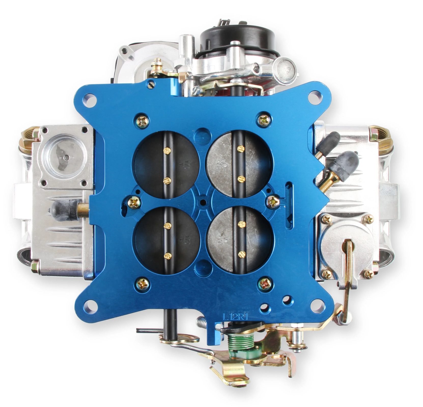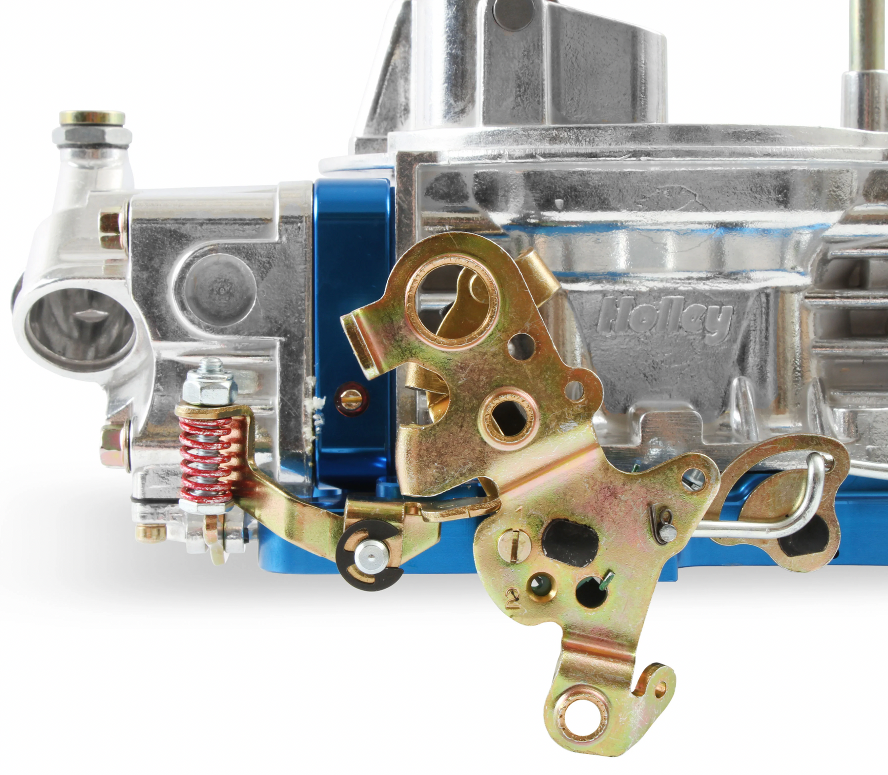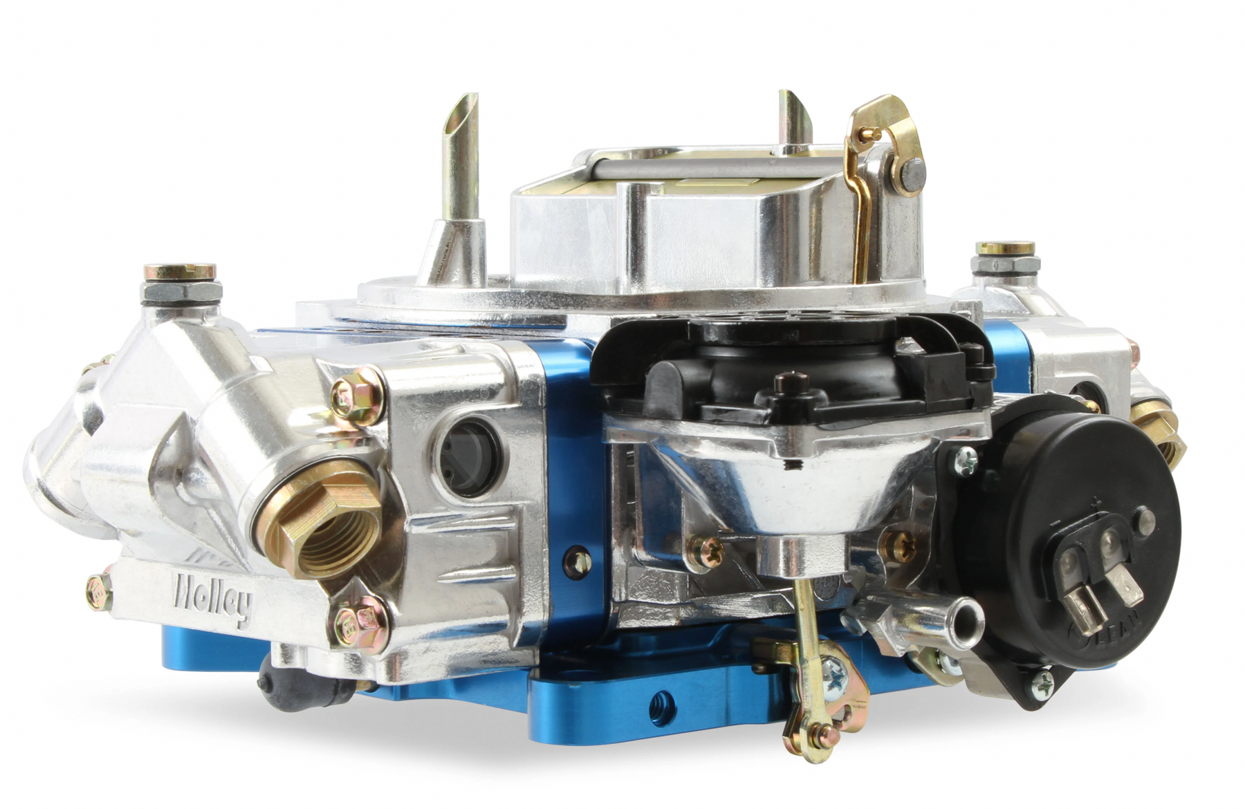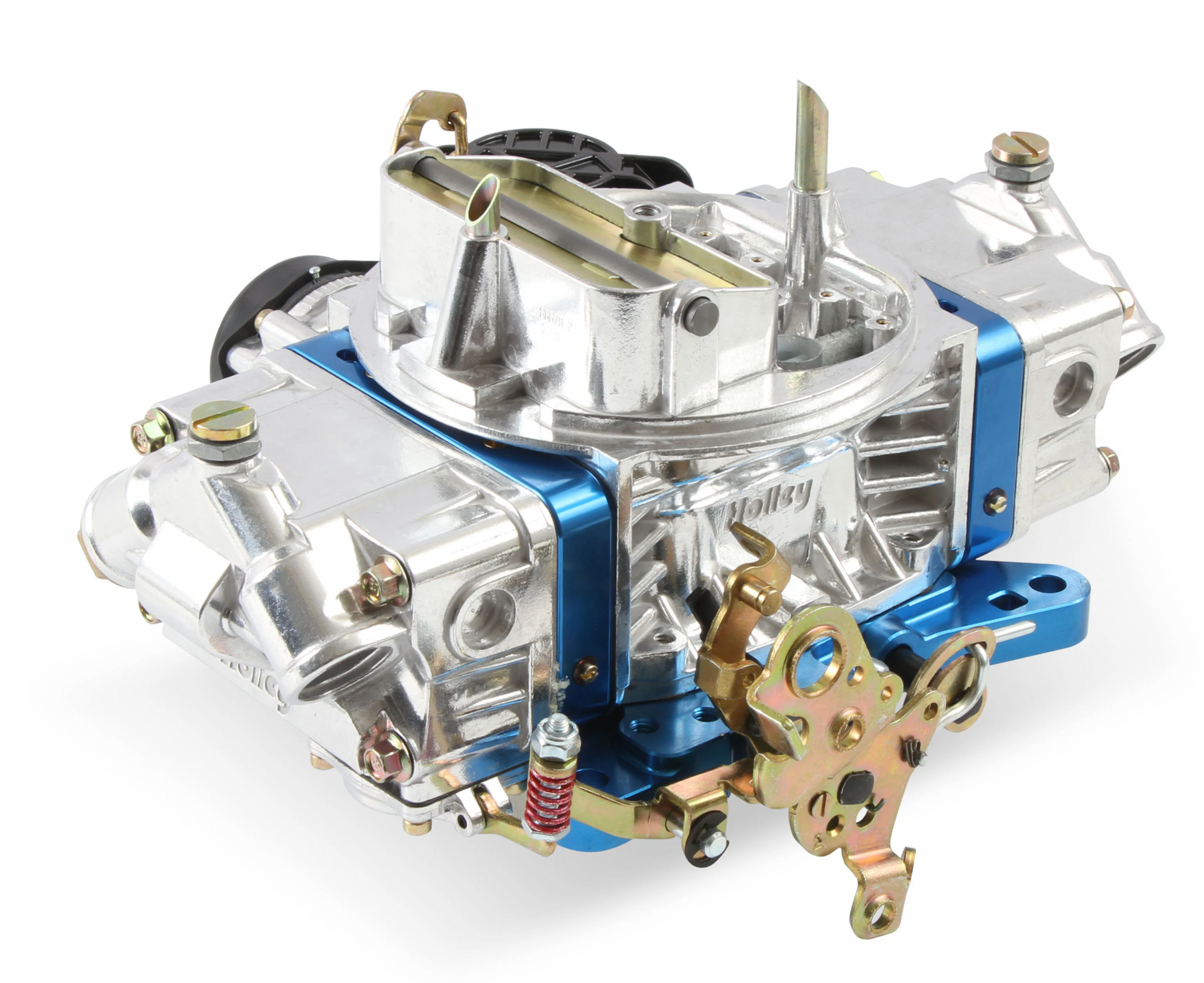 Shiny with blue anodized billet aluminum metering blocks/base plate for good looks and true gasket sealing
