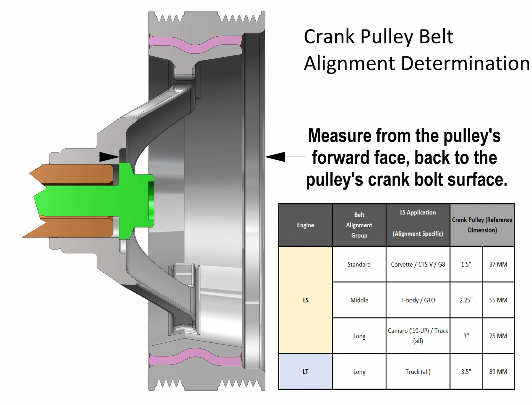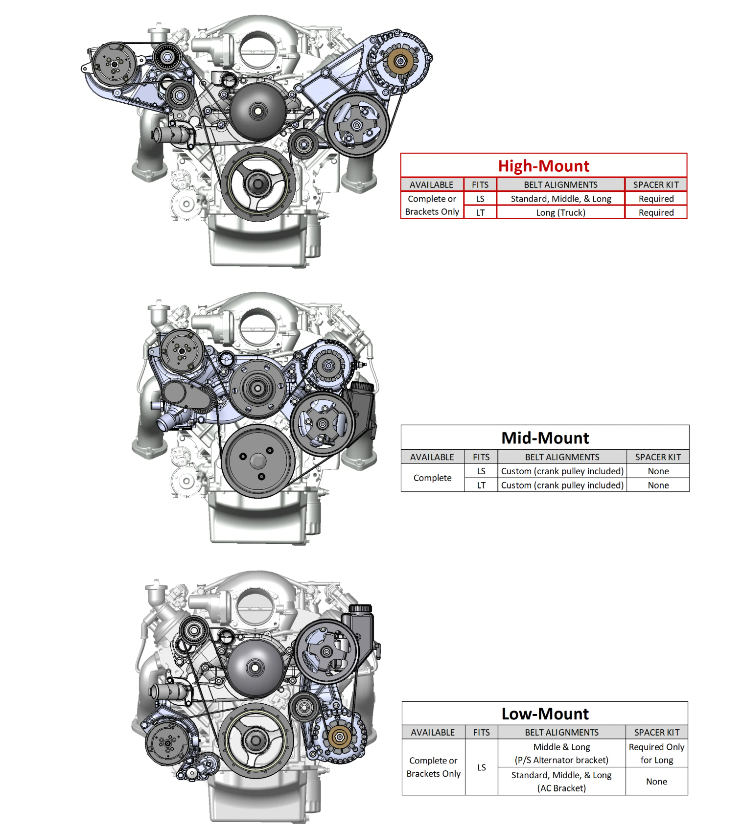 This accessory drive installation kit must be use with an LS water pump and the LT Truck harmonic balancer. There is only one belt spacing on this accessory drive kit. Corvette and other LT engines must be use the Truck harmonic balancer. Does not fit dry sump applications.