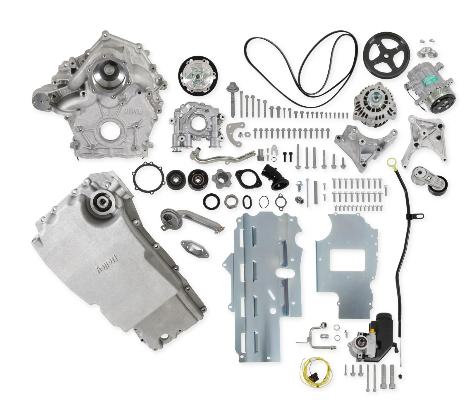 Installing a 7.3L Godzilla engine into a 65-79 F-series truck is the natural desire of many Ford truck enthusiasts. The OE GDZ oil pump location and the OE accessory drive present issues with GDZ engine swaps that Holley has sought to overcome. The Holley high-mount accessory drive, oiling system, and swap oil pan for the Ford 7.3-liter Godzilla engine effectively reduces the envelope this engine to make the GDZ engine a perfect fit. The integrated timing cover, oil pump, oil pan, water pump, alternator, and option for A/C and/or P/S, make a complete engineered swap solution for the classic F-series truck. The Holley system replaces Ford's sump-mounted oil pump with a high-capacity gerotor pump positioned behind the timing cover, gaining crucial crossmember and ground clearance. To ensure reliability, we have incorporated a proven pump design utilizing Melling sourced components that mimics the factory pressure level. Should your application require additional oil pressure, we offer a high-pressure spring kit (part# 302-102) for easy installation. Unlike most pumps that require removing the oil pan to change the pressure spring, we have introduced a first-of-its-kind external access port, allowing hassle-free spring switching. The F100 cast aluminum swap oil pan features a performance-minded windage tray and hinged trap-door baffle, guaranteeing proper oil pickup during high G maneuvers. Our accessory drive system offers flexible configuration options to meet various needs. Different alternator choices are available to cater to diverse performance and electrical requirements. If you prefer a customized modular setup, you can opt to exclude the A/C and/or P/S components. Holley's Godzilla High-Mount Accessory Drive is the ultimate solution for engine swaps, offering unparalleled functionality, adaptability, and ease of installation.