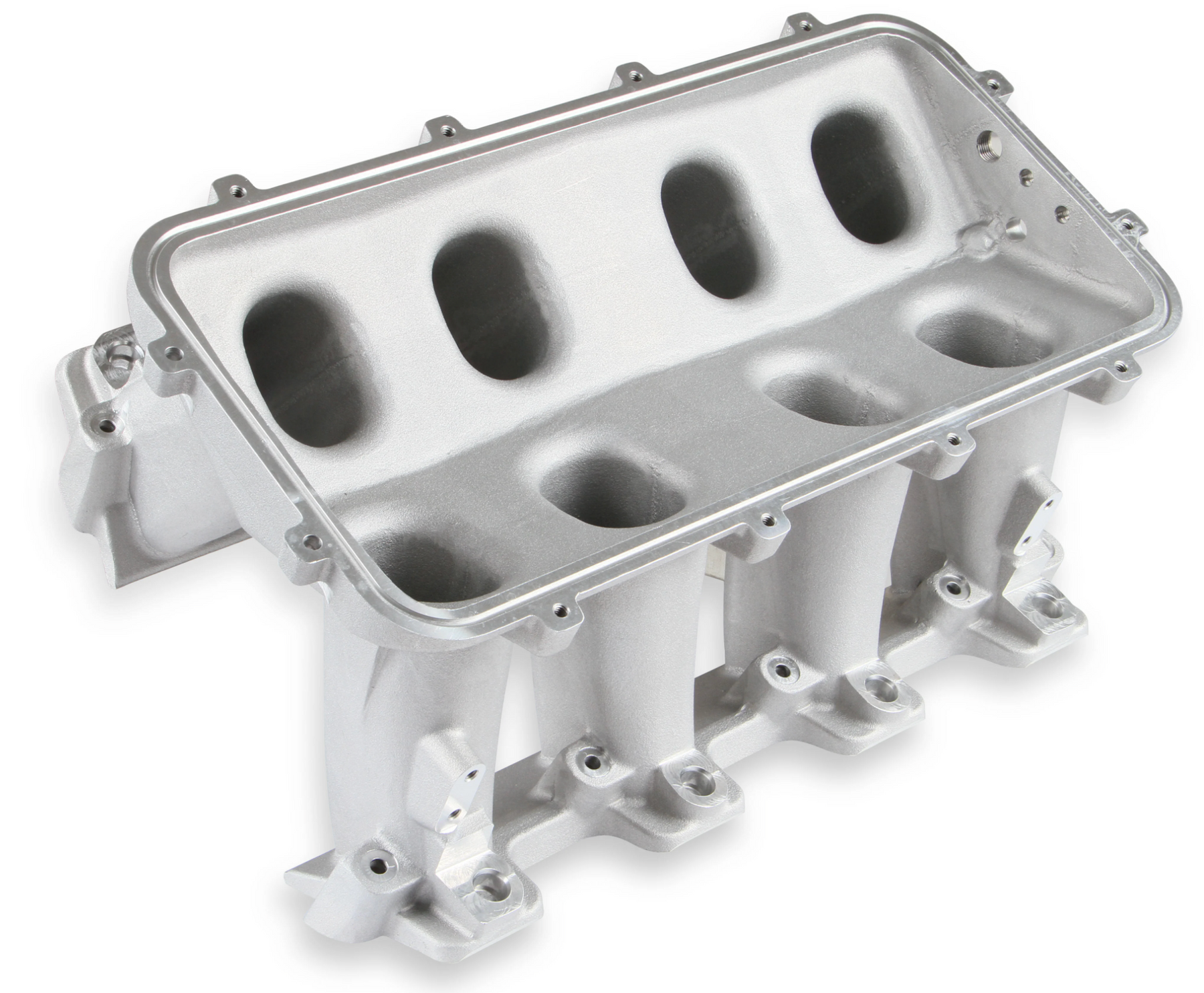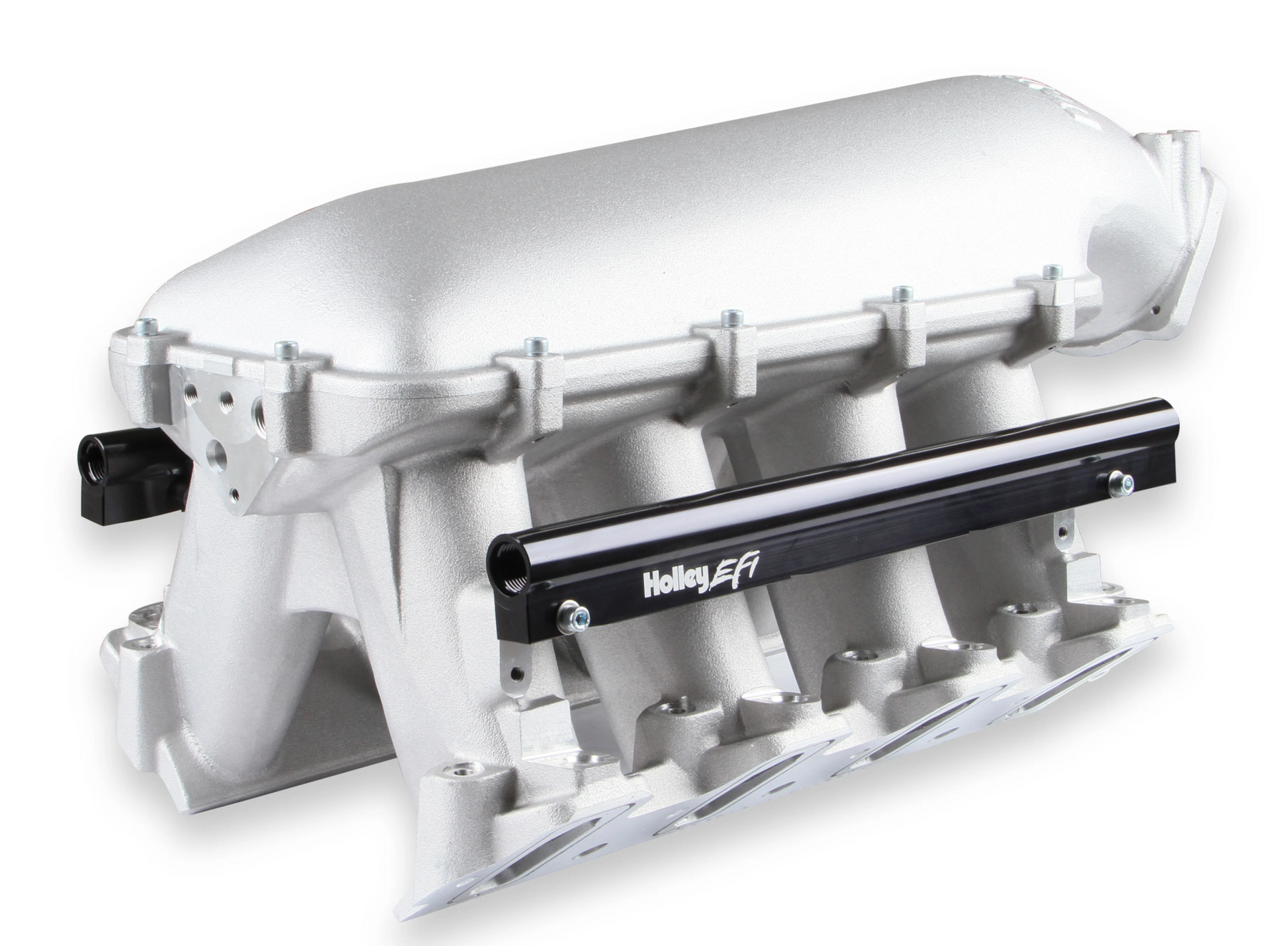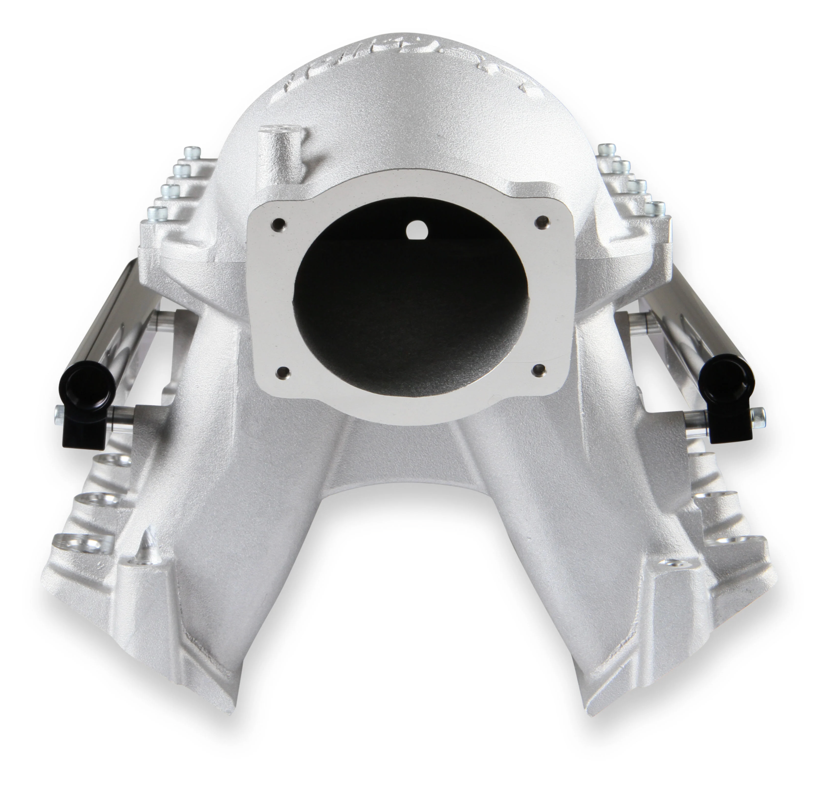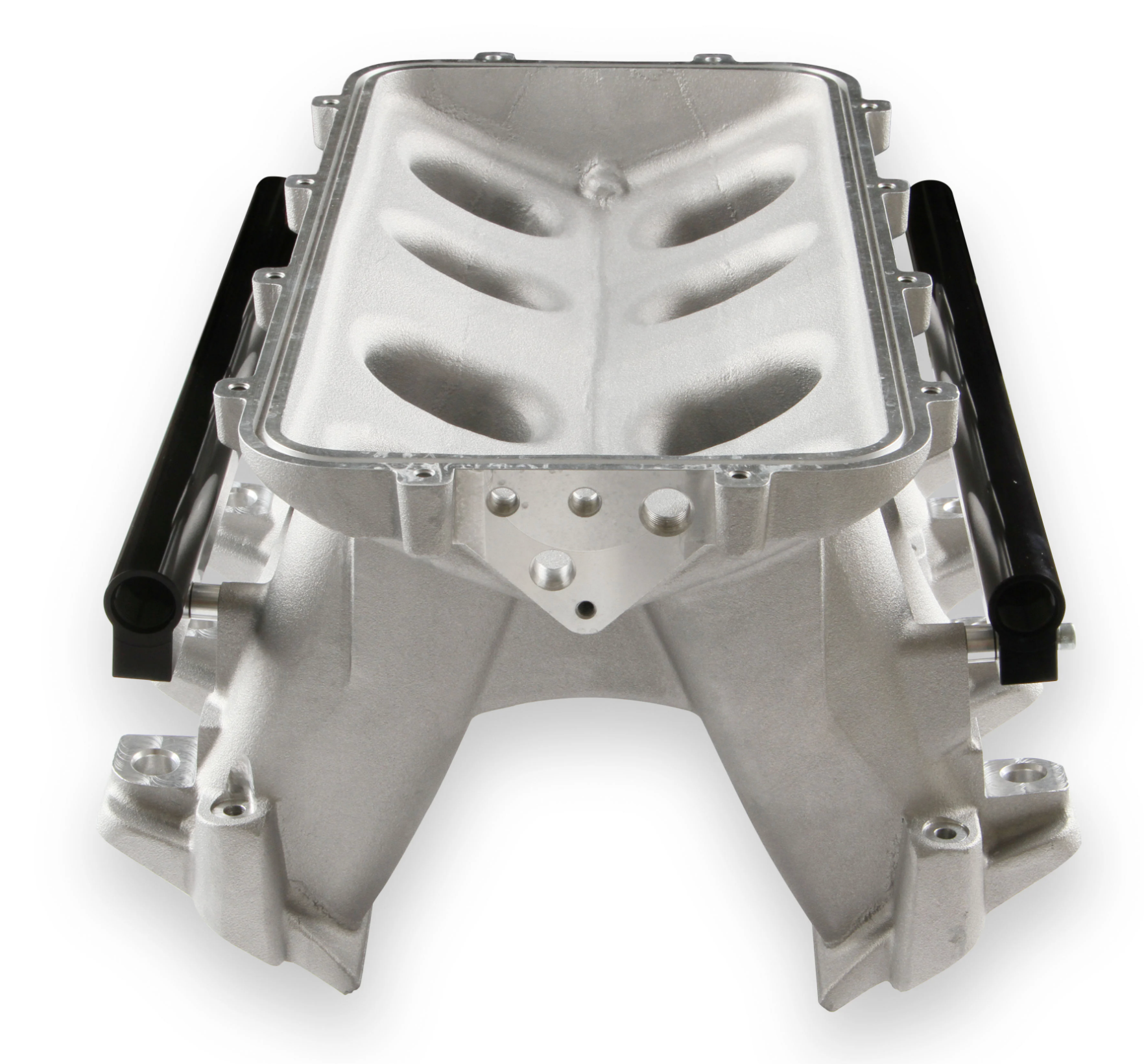 The Holley GM LS3/L92 Modular Hi-Ram Intake Manifold is introduced as a cost effective alternative to fabricated sheet-metal for high-performance applications where induction system height is not limited. Coupling this Hi-Ram intake with the high flowing LS3/L92 style cylinder heads has outstanding potential for N/A and forced induction applications at a budget-minded cost. Aggressive, bold, race-bred styling will make bad intentions clear for drag race, muscle car, marine, off-road, sandrails, pulling trucks, track, street-rod applications and more! • The base is designed to be modular in configuration to accept a wide range of carbureted and EFI tops and to be attractive to builders and fabricators as the foundation for custom induction systems. • Runner length and the tapered cross-section designed to perform well for a wide range of engine configurations • EFI fuel rails are machined for -8AN O-ring fittings with passages large enough to accommodate high fuel flows and dampen pressure pulsations in the fuel system and come standard with EFI Hi-Ram kits. • Cast aluminum construction. • Intended for use on N/A or forced induction engines in the 6.0 to 7.0+ liter range, max power at 7000-8000+RPM.