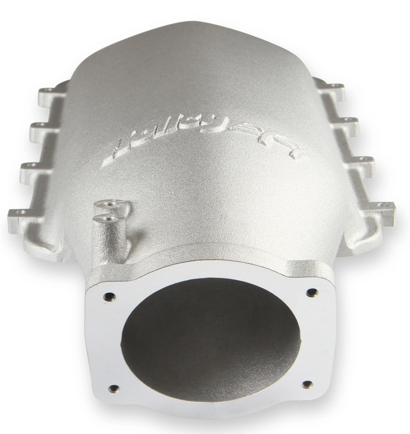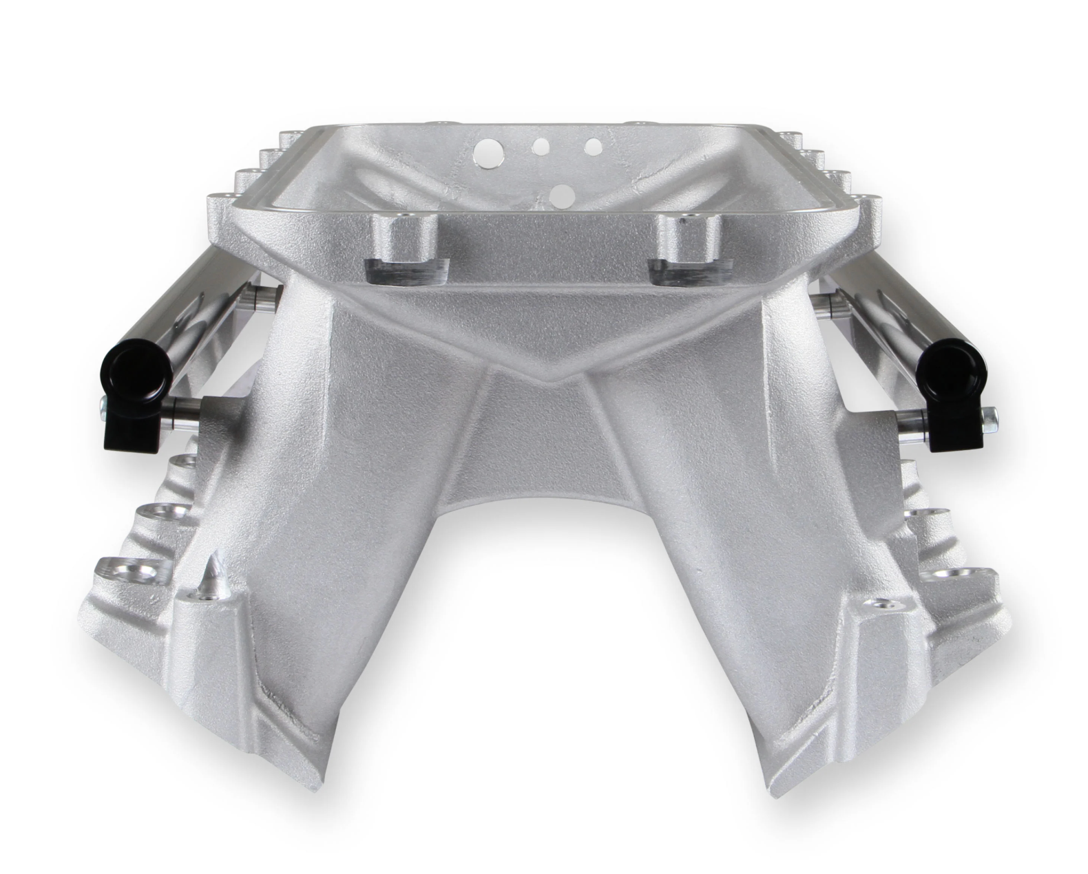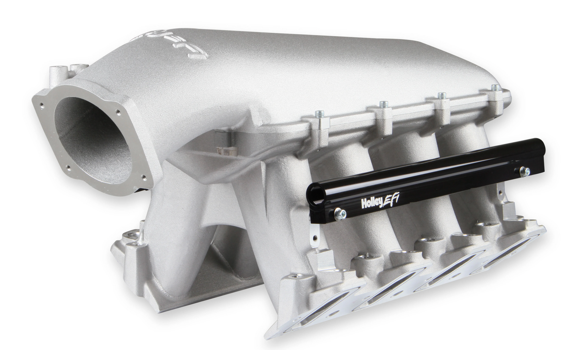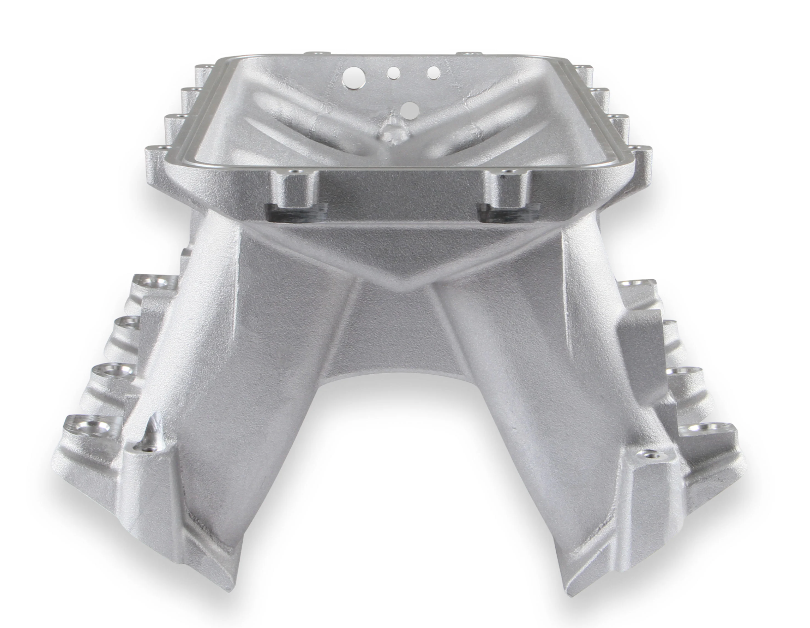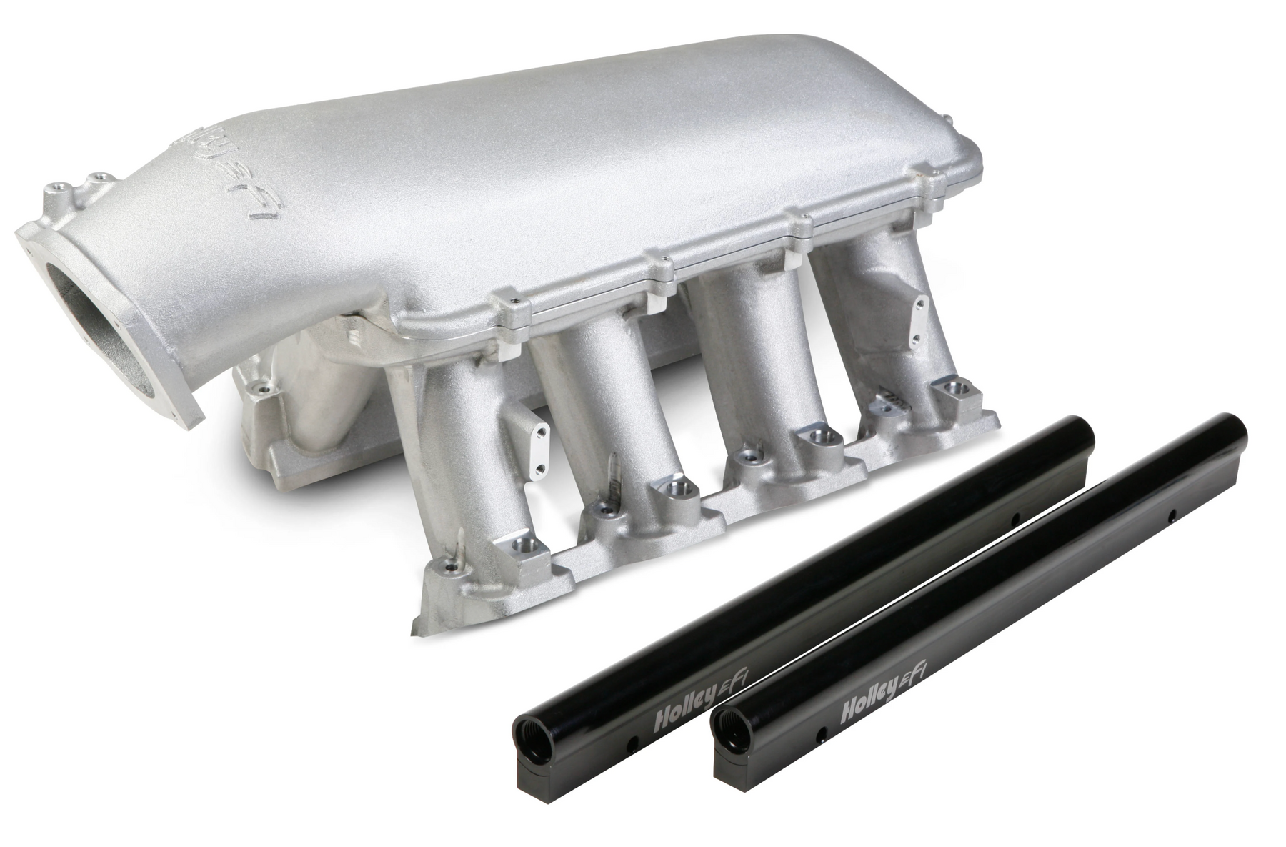 The Holley GM LS3/L92 Modular Hi-Ram Intake Manifold is introduced as a cost effective alternative to fabricated sheet-metal for high-performance applications where induction system height is not limited. Coupling this Hi-Ram intake with the high flowing LS3/L92 style cylinder heads has outstanding potential for N/A and forced induction applications at a budget-minded cost. Aggressive, bold, race-bred styling will make bad intentions clear for drag race, muscle car, marine, off-road, sandrails, pulling trucks, track, street-rod applications and more! • The base is designed to be modular in configuration to accept a wide range of carbureted and EFI tops and to be attractive to builders and fabricators as the foundation for custom induction systems. • Runner length and the tapered cross-section designed to perform well for a wide range of engine configurations • EFI fuel rails are machined for -8AN O-ring fittings with passages large enough to accommodate high fuel flows and dampen pressure pulsations in the fuel system and come standard with EFI Hi-Ram kits. • Cast aluminum construction. • Intended for use on N/A or forced induction engines in the 6.0 to 7.0+ liter range, max power at 7000-8000+RPM.