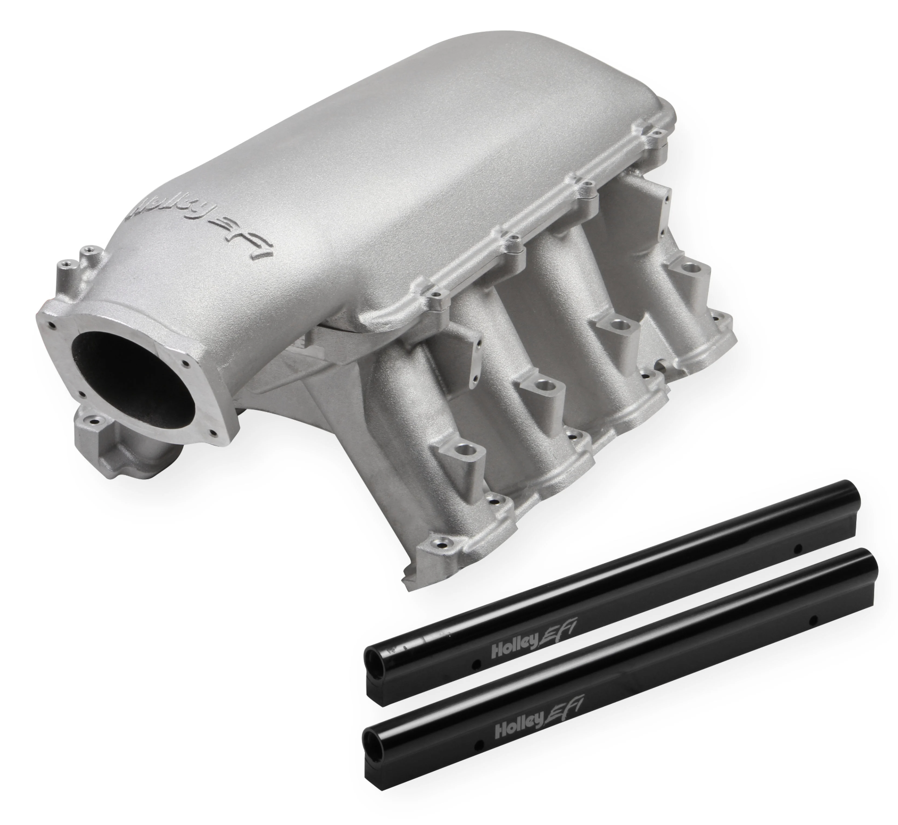 The new Holley EFI Hi-Ram intake provides the ultimate performance with the new GM direct injected Gen V 6.2L LT1 engine. The modular design of this manifold allows easy disassembly for custom porting, multiple tops, or custom induction systems. Each runner has a large radius where it meets the plenum, and optimized taper & cross-sectional area to perform in a wide variety of engine configurations. The optional injector bosses on the intake runners allow increased performance potential by using additional injectors along with the factory direct injection. When you look for the pinnacle of performance, price, and quality, look to Holley EFI.