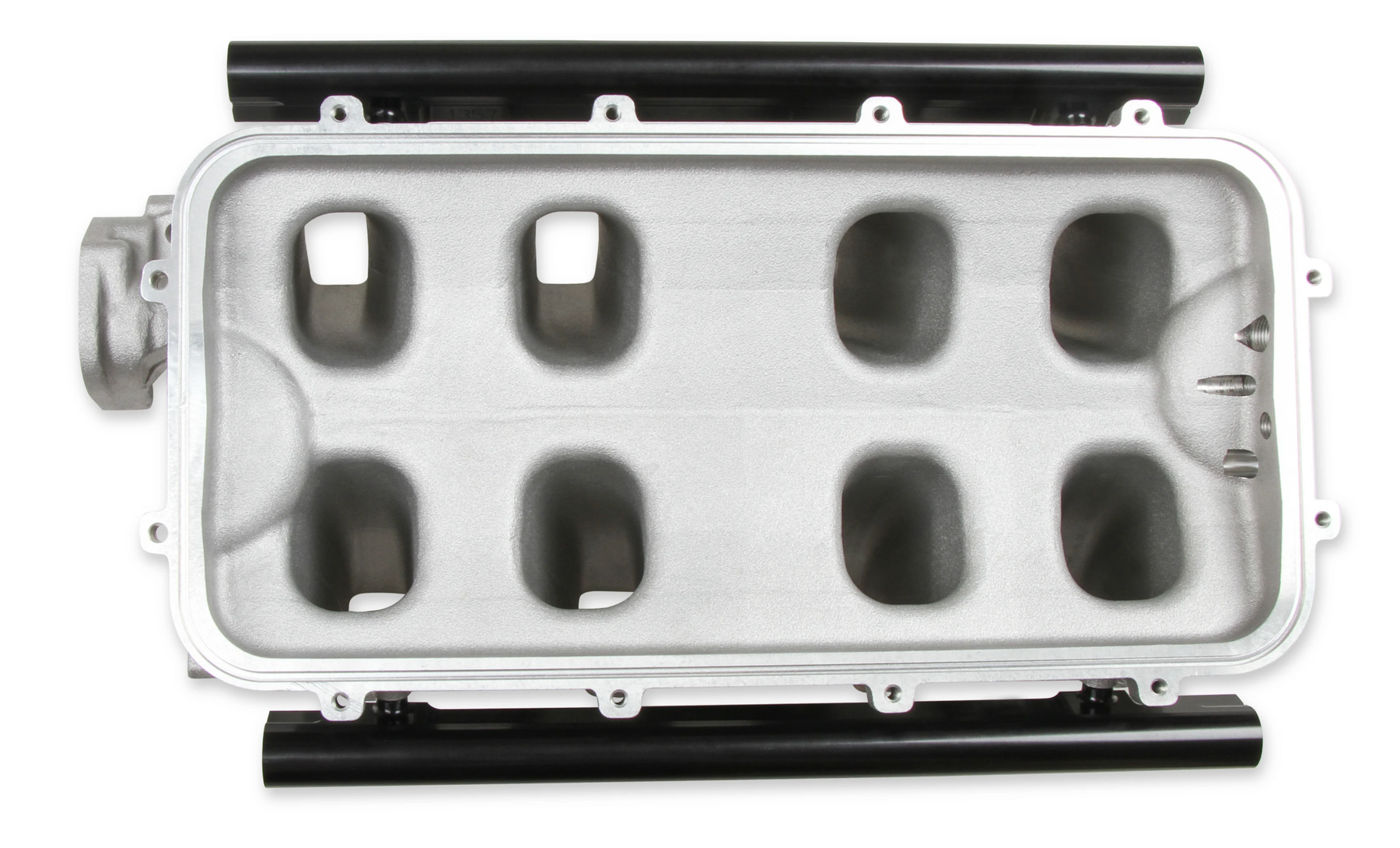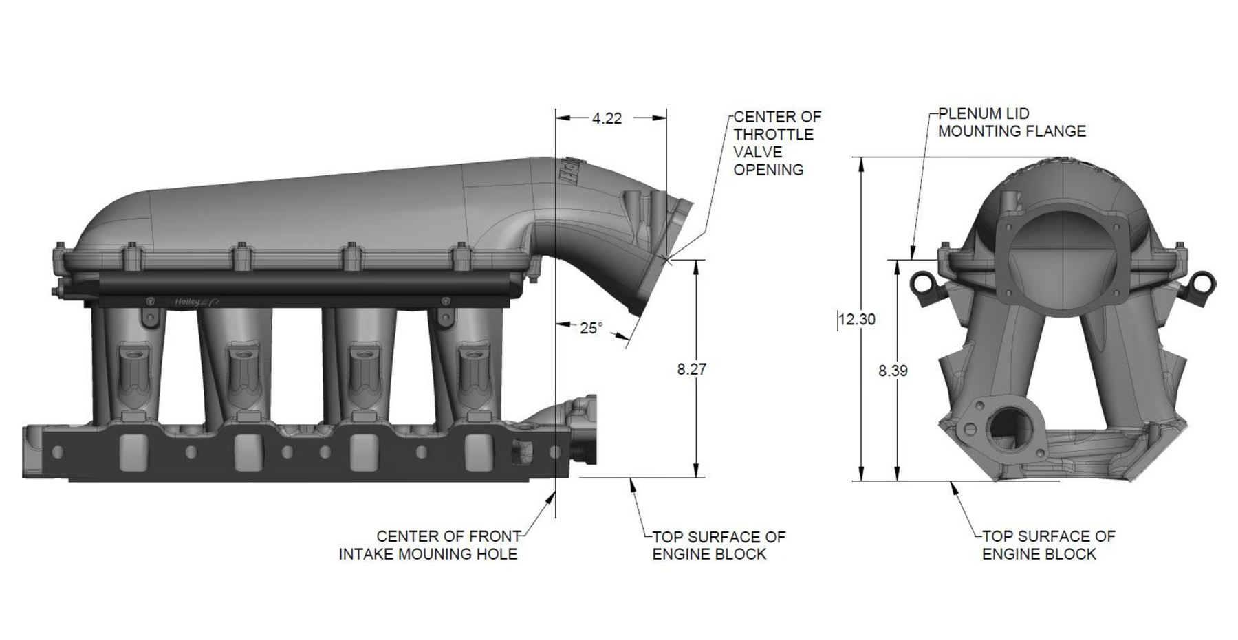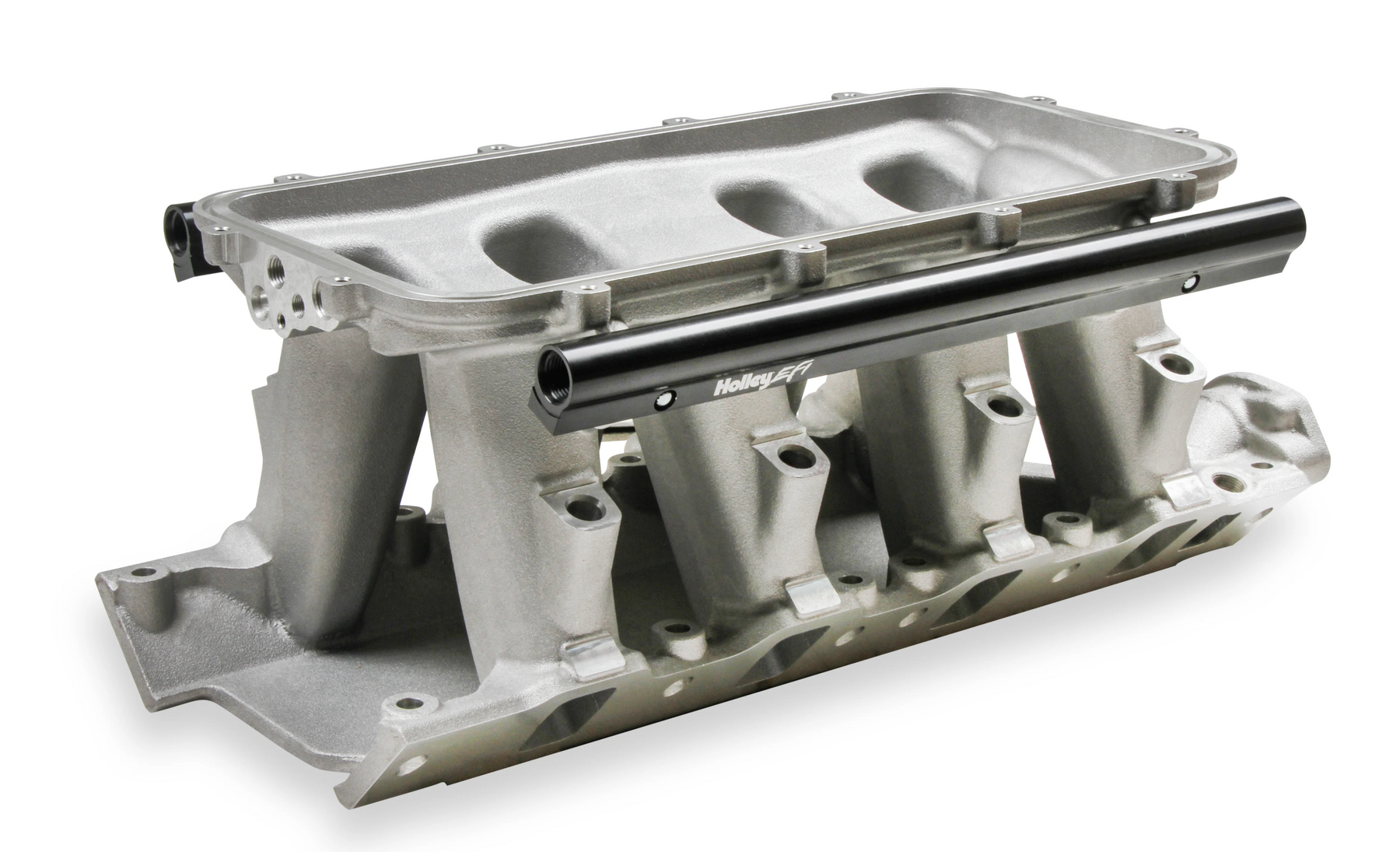 The EFI Hi-Ram manifold line has a new addition for the 8.2" SBF Ford application. The runner length and tapered cross section design will perform well for a wide range of engine combinations. The engineering team also redesigned the water crossover passage to allow room for distributor phasing. Aggressive, bold, race-bred styling will make bad intentions clear for drag race, muscle car, marine, off-road, sandrails, pulling trucks, track, street-rod applications and more! Manifold is designed for a 8.2" deck height. • Runner length and the tapered cross-section designed to perform well for a wide range of engine configurations • EFI fuel rails are machined for -8AN O-ring Fittings with passages large enough to accommodate high fuel flows and dampen pressure pulsations in the fuel system and come standard with EFI Hi-Ram kits. • Cast aluminum construction. ***EFI Base Manifold only-Manifold tops available seperately. *** A low profile distributor will be needed when using this manifold. We have a Sniper Hyperspark version #565-322 and a Holley EFI Dual Sync #565-211 available.
