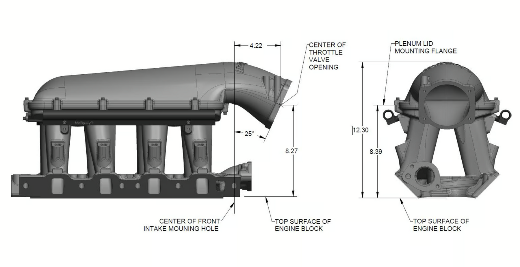 The EFI Hi-Ram manifold line has a new addition for the 8.2" SBF Ford application. The runner length and tapered cross section design will perform well for a wide range of engine combinations. The engineering team also redesigned the water crossover passage to allow room for distributor phasing. Aggressive, bold, race-bred styling will make bad intentions clear for drag race, muscle car, marine, off-road, sandrails, pulling trucks, track, street-rod applications and more! Manifold is designed for a 8.2" deck height. • Runner length and the tapered cross-section designed to perform well for a wide range of engine configurations • EFI fuel rails are machined for -8AN O-ring Fittings with passages large enough to accommodate high fuel flows and dampen pressure pulsations in the fuel system and come standard with EFI Hi-Ram kits. • Cast aluminum construction. ***EFI Base Manifold only-Manifold tops available seperately. *** A low profile distributor will be needed when using this manifold. We have a Sniper Hyperspark version #565-322 and a Holley EFI Dual Sync #565-211 available.