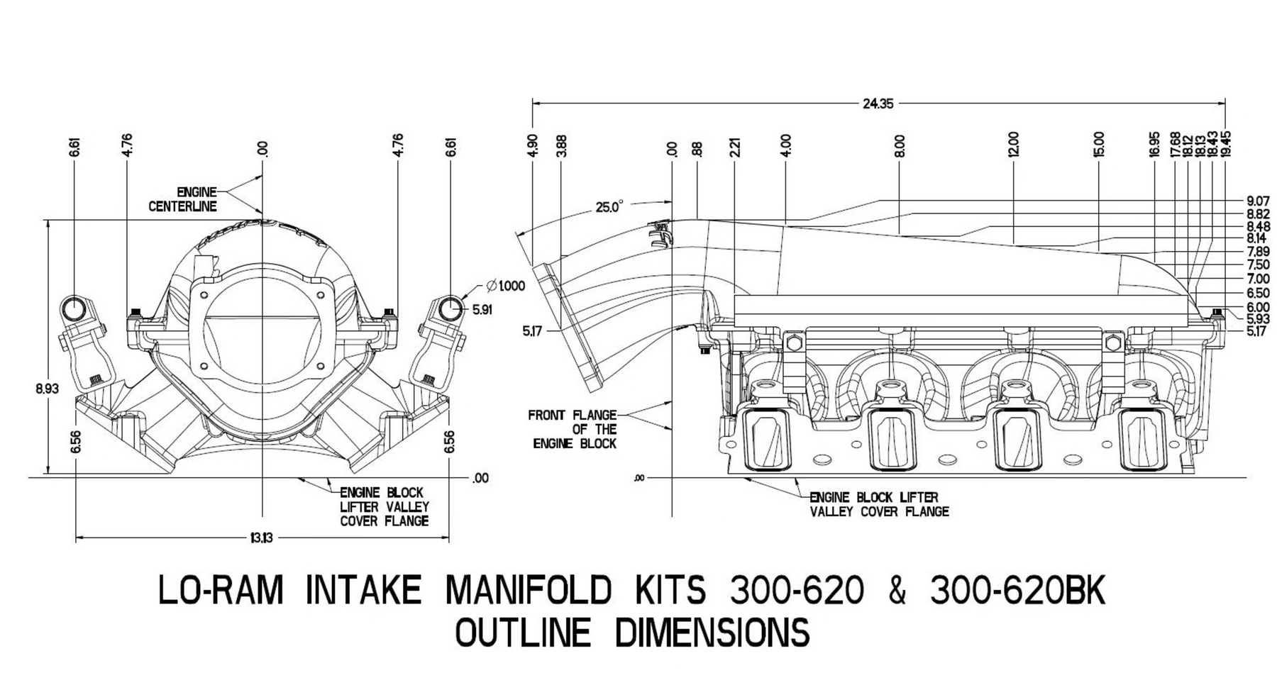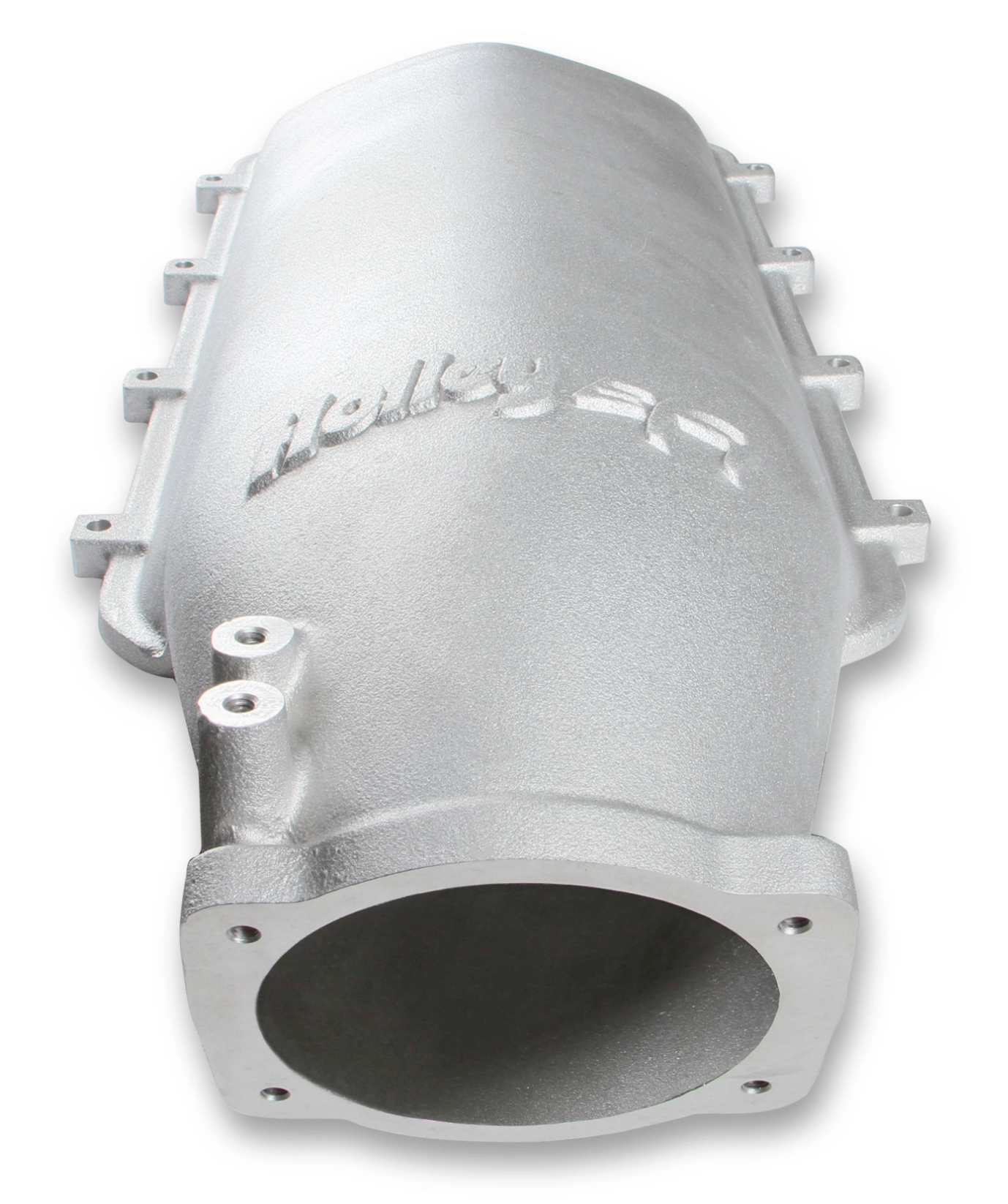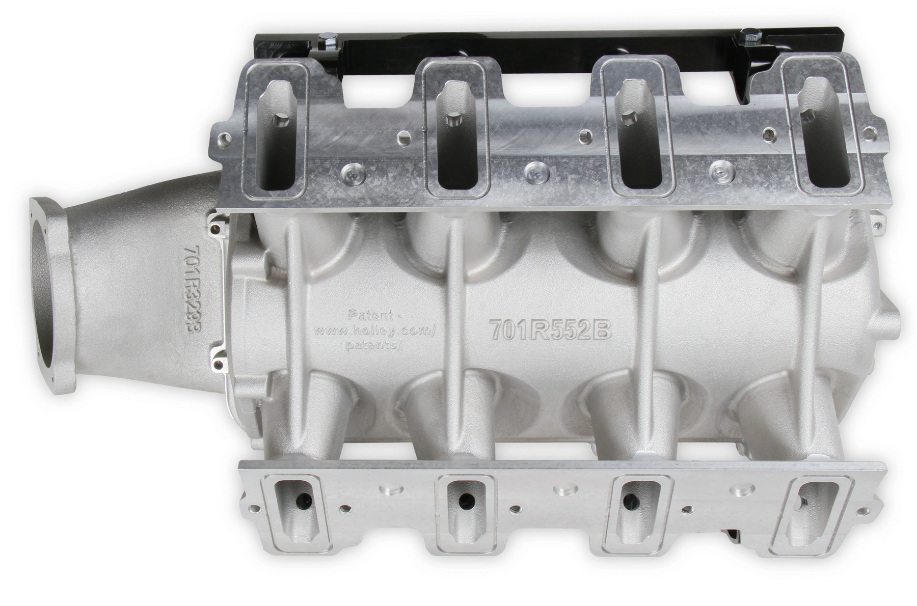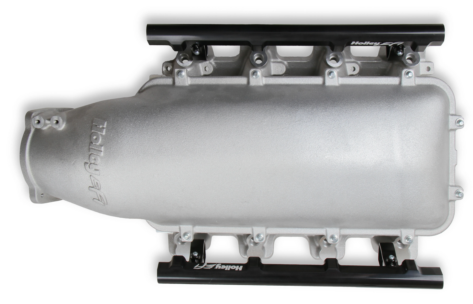 The Holley LS1/2/6 Lo-Ram intake manifold kits are designed for GM LS Gen III and IV engines equipped with GM LS1/2/6 (cathedral port) cylinder heads. These intake manifolds will work with OE or aftermarket cylinder heads. The Lo-Ram intake manifolds are designed for forced induction (supercharged or turbocharged) engine applications and the 105 mm throttle body part number 112-581 or similar models. The base intake manifold is designed with a low height to aid the packaging of a plenum-mounted air-to-water intercooler in a top-feed configuration. The 300-620 plenum entry configuration is designed to allow the included Hi-Ram 105 mm plenum top to be fitted to a low-profile base intake manifold. The short runner, low-profile base intake manifold intended for forced induction applications was conceived to package with an air to water plenum mounted intercooler with a shorter overall height than possible with other existing intake manifolds. The fuel rail kits come with two sets of brackets. A set for long (usually standard length) fuel injectors and a set for short (such as Pico, or LS7) fuel injectors.