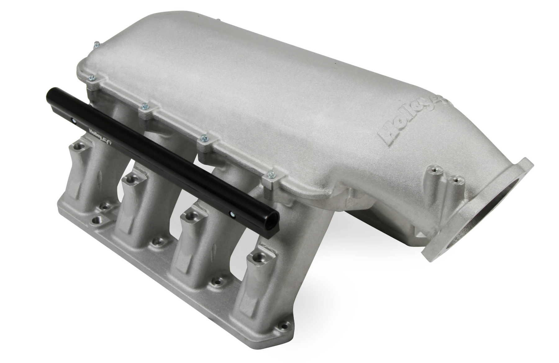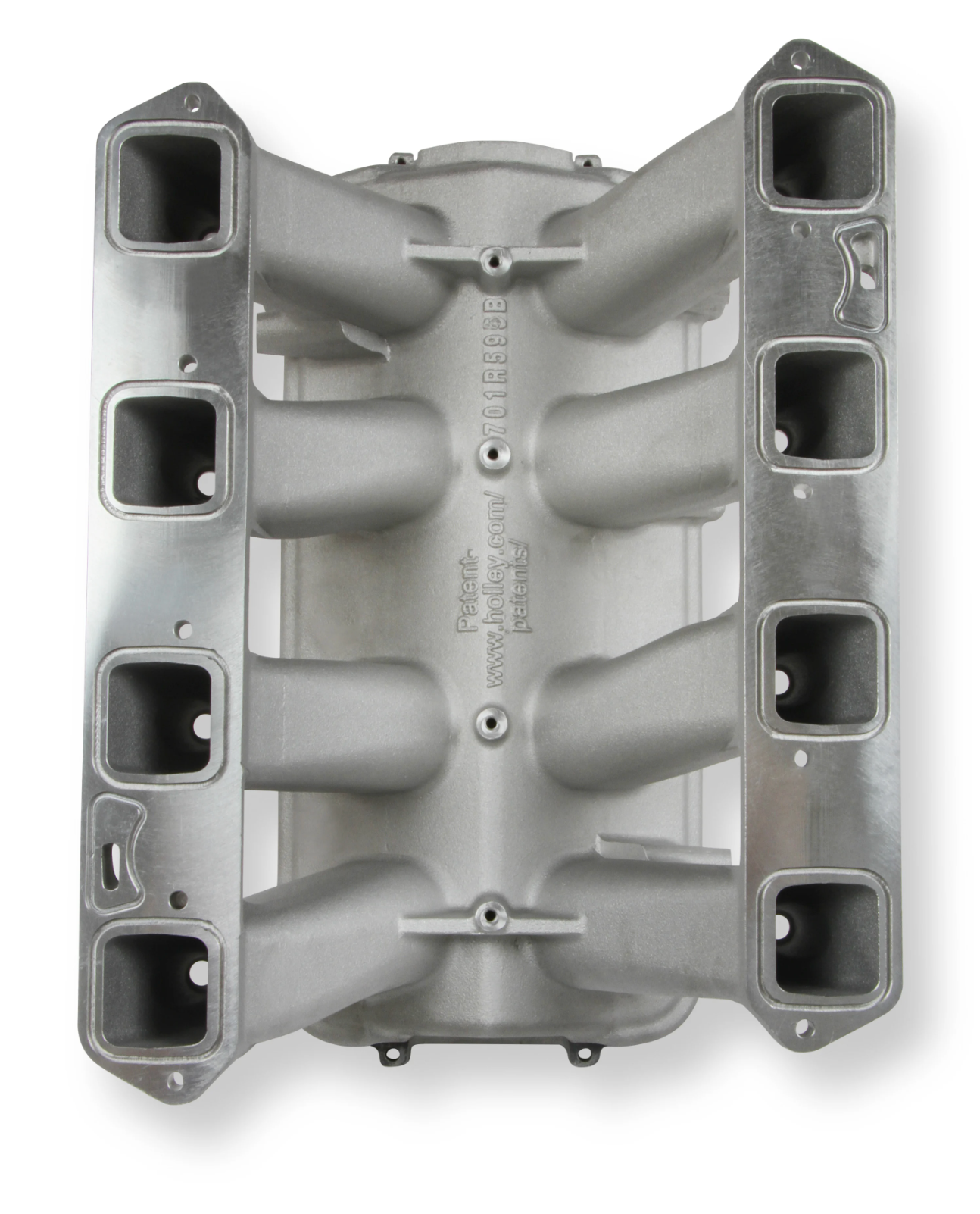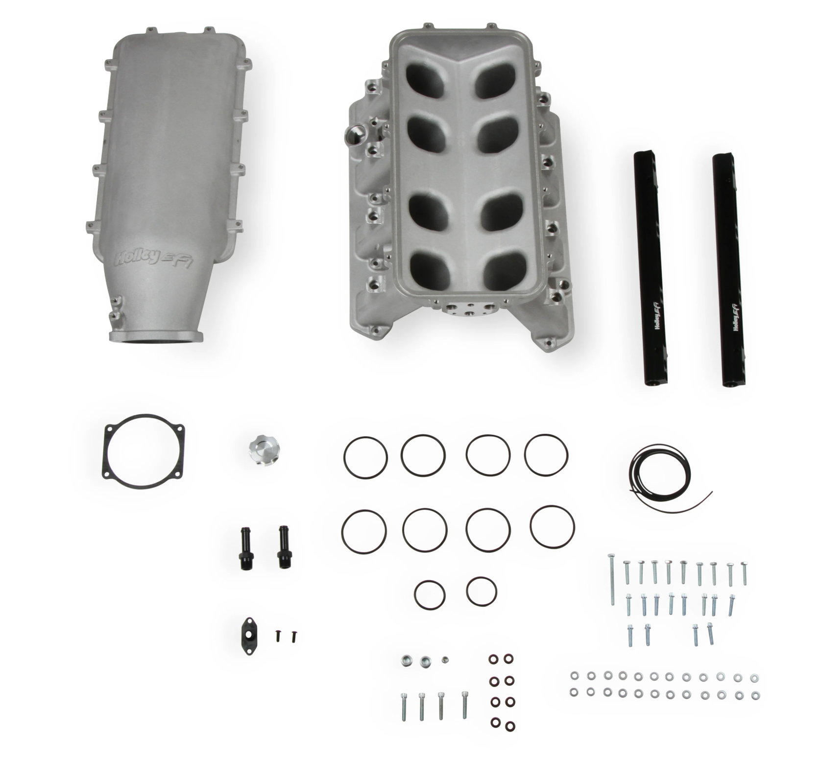 Add even more power to your Gen III Hemi engine with a Holley Hi-Ram intake manifold. This cast intake manifold has large intake ports - fits 2009-up 5.7L, 2005-2010 6.1L & 2011-up 6.4L engines. The Holley Hi-Ram intake manifold is for high-performance applications where induction system height is not limited. Using this Hi-Ram intake with high flowing Gen III Hemi cylinder heads has outstanding potential for naturally aspirated & forced induction applications. Aggressive, bold, race-bred styling will make bad intentions clear for drag race, muscle car, marine, off-road, sandrails, pulling trucks, track, street-rod applications and more! The base is designed to be modular in configuration to accept a wide range of EFI tops and to be attractive to builders and fabricators as the foundation for custom induction systems. Runner length and the tapered cross-section designed to perform well for a wide range of engine configurations. The EFI fuel rails are machined for -8AN O-ring fittings with passages large enough to accommodate high fuel flow and dampen pressure pulsations in the fuel system and come standard with EFI Hi-Ram kits. Intended for use on naturally aspirated, forced induction, or nitrous engines in the 5.7 to 7.2+ liter range, max power at 7500-8500 RPM.