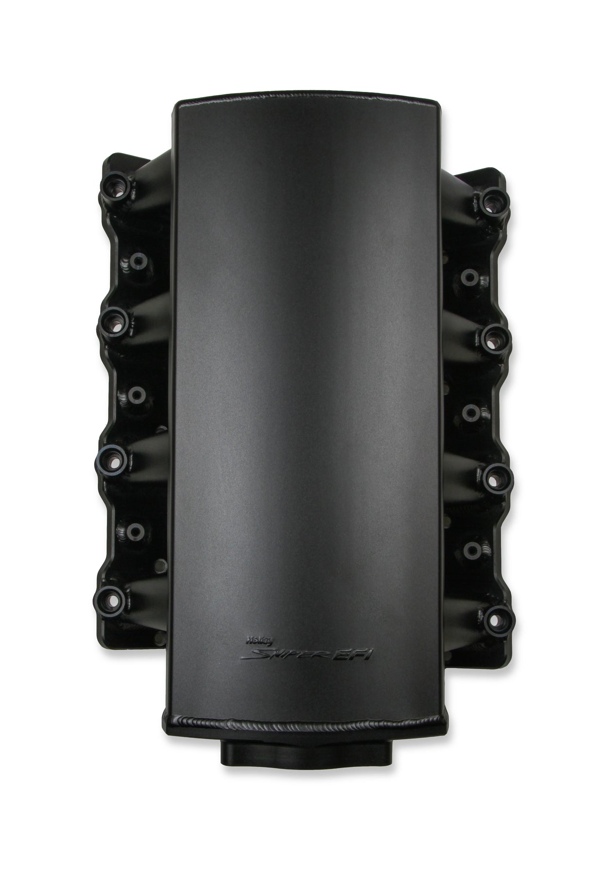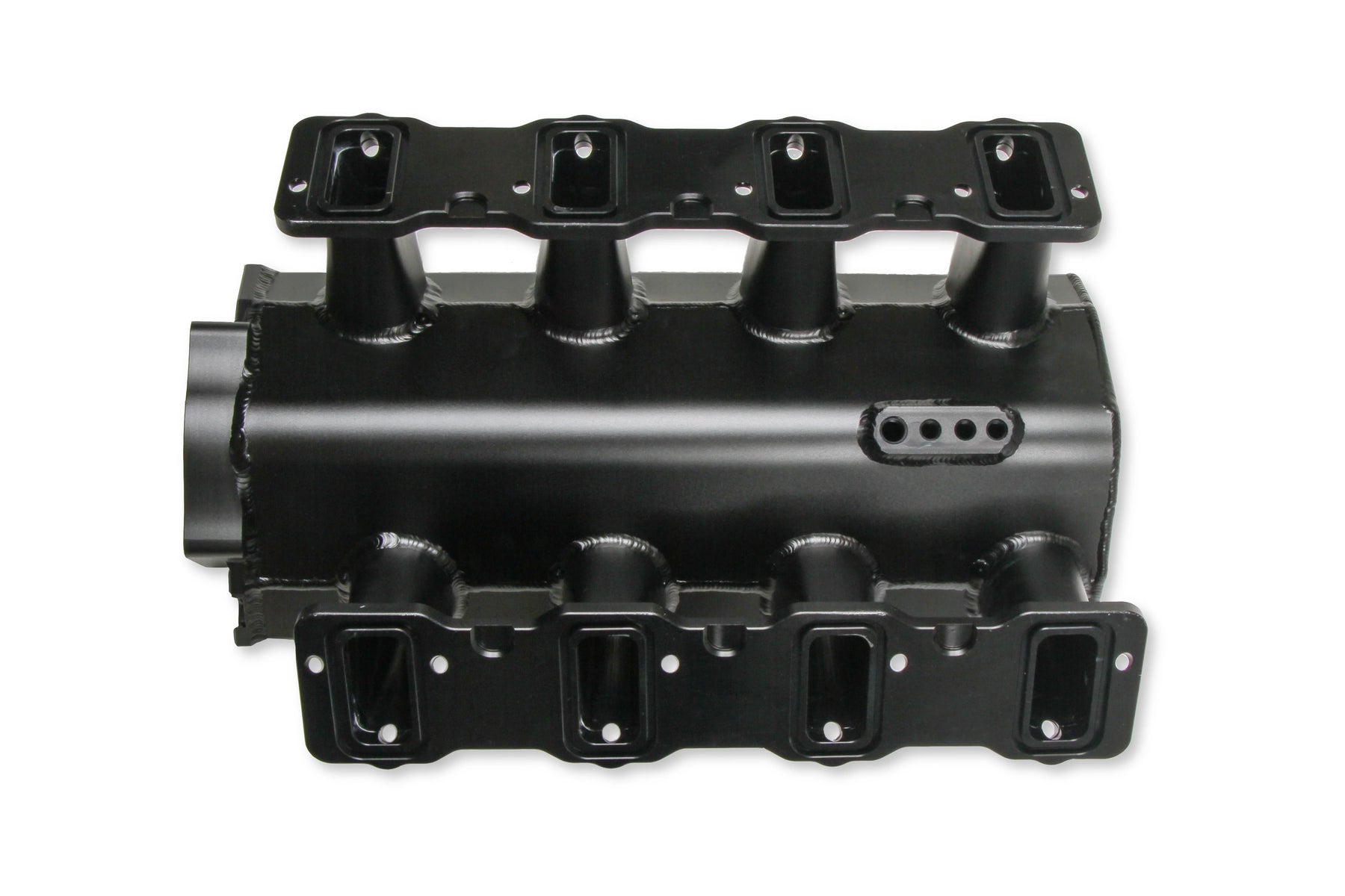 The Holley GM LS3/L92 Modular Hi-Ram Intake Manifold is introduced as a cost effective alternative to fabricated sheet-metal for high-performance applications where induction system height is not limited. Coupling this Hi-Ram intake with the high flowing LS3/L92 style cylinder heads has outstanding potential for N/A and forced induction applications at a budget-minded cost. Aggressive, bold, race-bred styling will make bad intentions clear for drag race, muscle car, marine, off-road, sandrails, pulling trucks, track, street-rod applications and more! • The base is designed to be modular in configuration to accept a wide range of carbureted and EFI tops and to be attractive to builders and fabricators as the foundation for custom induction systems. • Runner length and the tapered cross-section designed to perform well for a wide range of engine configurations • EFI fuel rails are machined for -8AN O-ring fittings with passages large enough to accommodate high fuel flows and dampen pressure pulsations in the fuel system and come standard with EFI Hi-Ram kits. • Cast aluminum construction. • Intended for use on N/A or forced induction engines in the 6.0 to 7.0+ liter range, max power at 7000-8000+RPM.