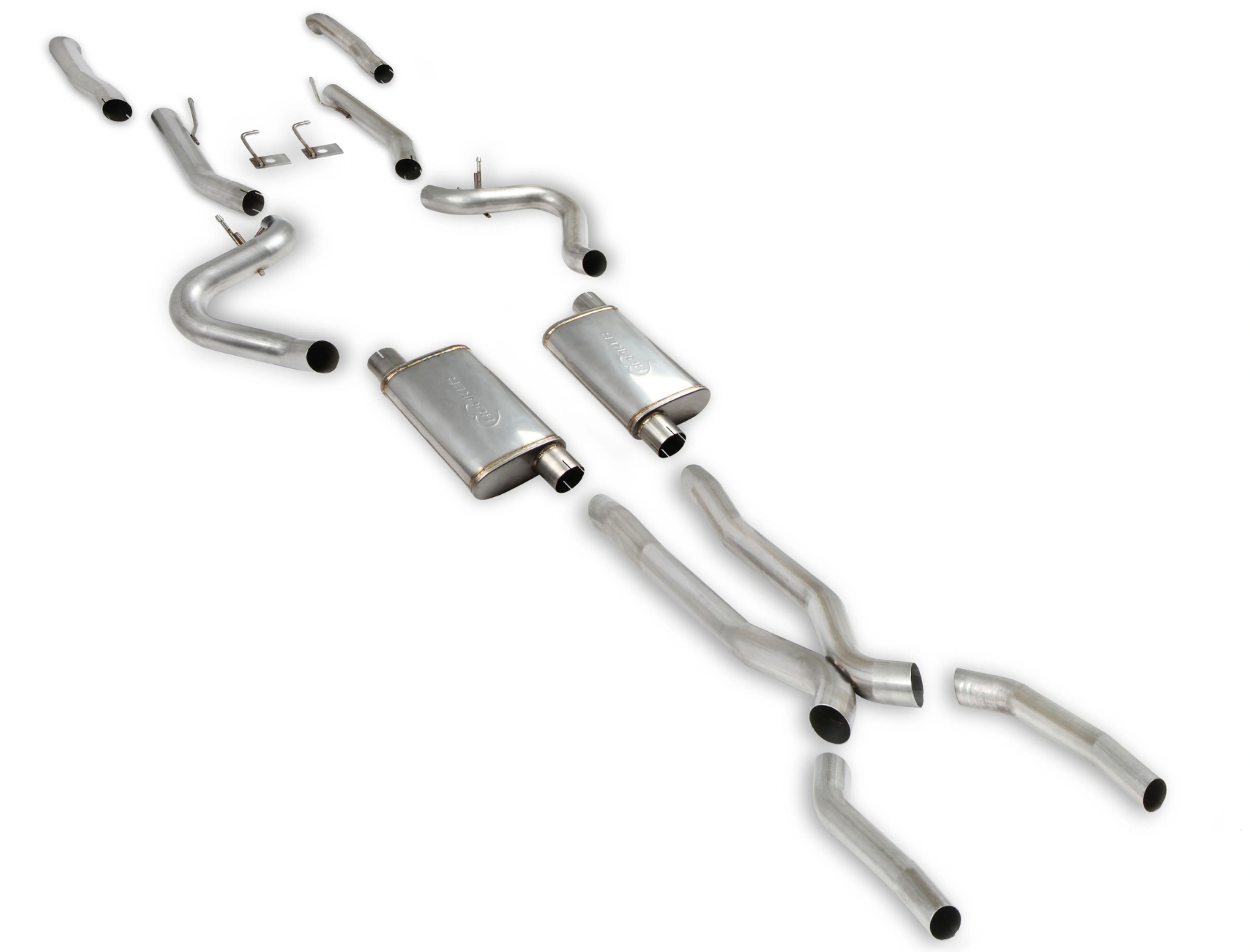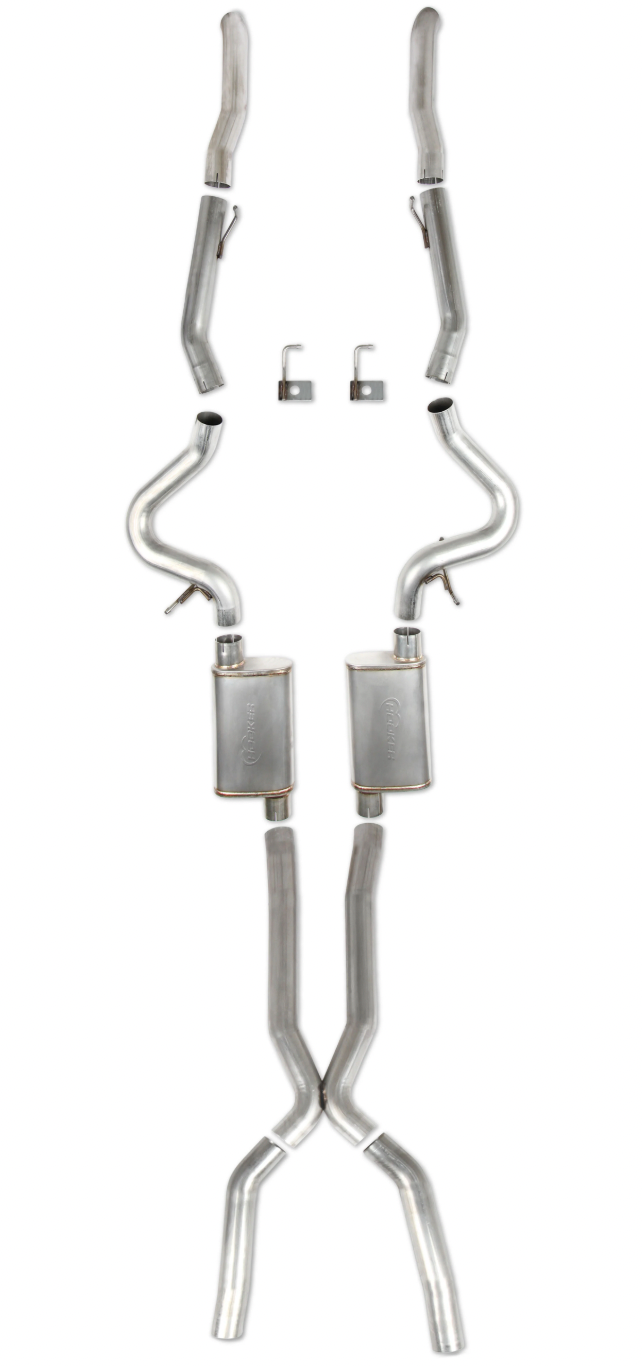 This Hooker BlackHeart exhaust system was specially designed for 1967-1974 Mopar A-Body and is perfect for the person looking for moderate to aggressive interior and exterior sound levels. The crossmember-back exhaust system comes complete with a built-in X-pipe crossover, all mandrel-bent 2.50 or 3.00-inch 304 stainless steel tubing. The system includes all hardware necessary for installation and is designed to accommodate 111-inch or 108-inch wheelbases, and provides adequate clearance for substantially lowered vehicles. The exhaust system is covered by our Limited Lifetime Warranty. Notes: Optional exhaust tips are available separately. Exhaust fitment confirmed with Gen III Hemi and the following transmissions: A727, NAG1, TKX (Chevy with RM-8079 bellhousing), 8HP70, 8HP90, TR-6060, and T56 magnum
