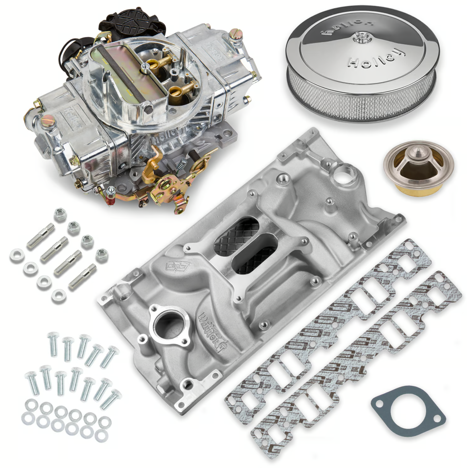 We have combined the Street Avenger carburetor and intake manifold into a kit form that includes all of the gaskets, bolts, and an air cleaner for a complete installation. Street Avenger carburetors are known to bolt on right out of the box and have great features such as a quick change vacuum secondary for easy fine tuning; optimized street calibrations; four vacuum ports for all necessary vacuum accessories; factory preset electric choke for easy start ups; built-in fuel filters; and an included fuel line kit so there are no unnecessary trips back to the parts store. The Avenger series are the first carburetors to have a limited lifetime warranty. With a great warranty like that and the included comprehensive instruction manual, you can count on years of worry free service.