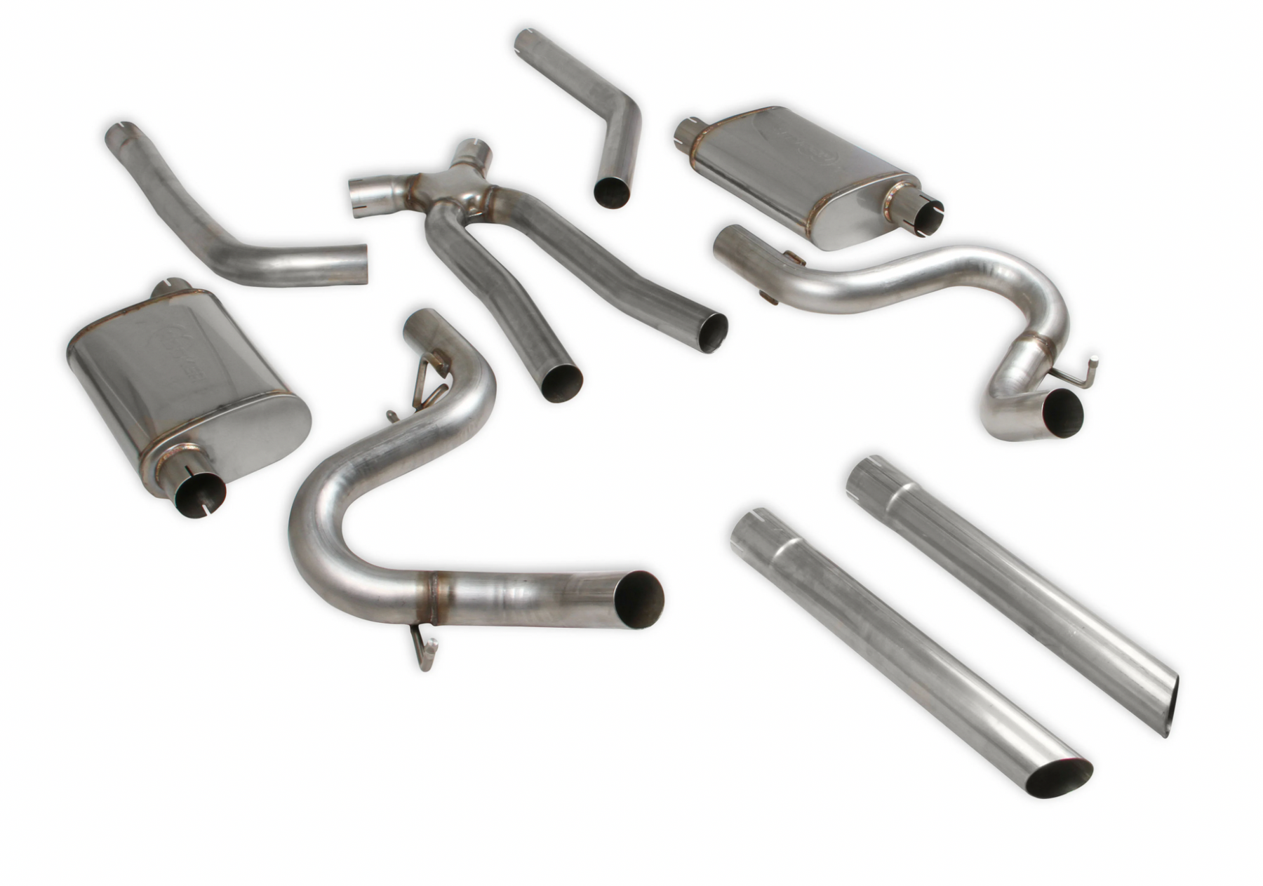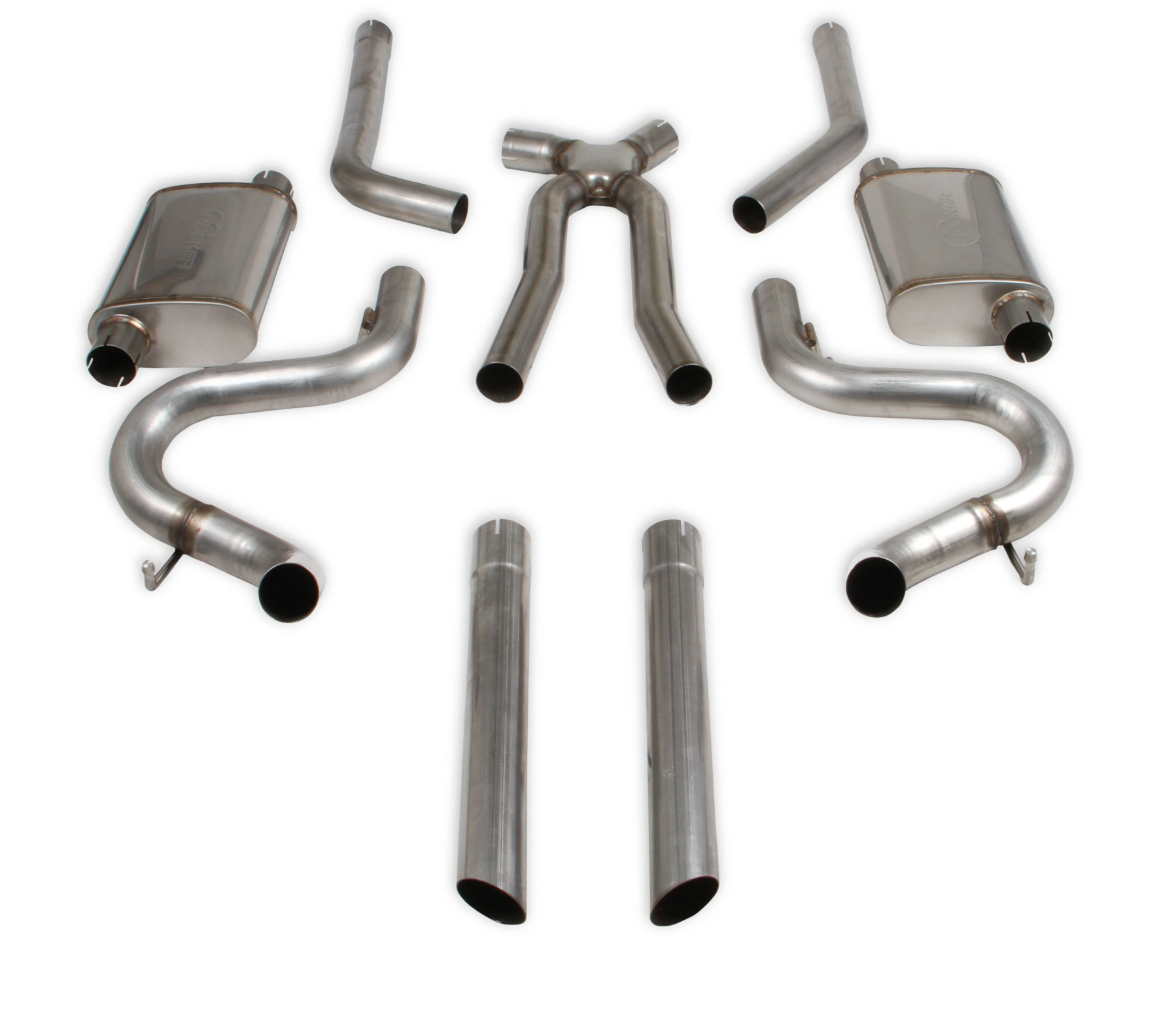 This full stainless steel exhaust system comes complete with a stamped crossover for a broad torque curve and TIG welded stainless steel straight-through absorption style mufflers. It is dual 2.5-inch with a single turn-down exit under each quarter panel for a stealthy look. Although these systems have been specifically developed for direct fitment with HOOKER™ LS swap components for these applications, they will provide equally beneficial fitment, function, and service life with other non-Hooker LS swap manifolds/headers. Can easily be made to work on non-LS engine-equipped G-bodies through modification of the system inlet tubes, or construction of new ones by a competent fabricator.