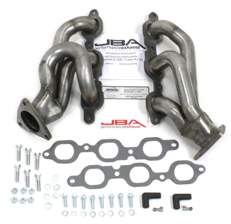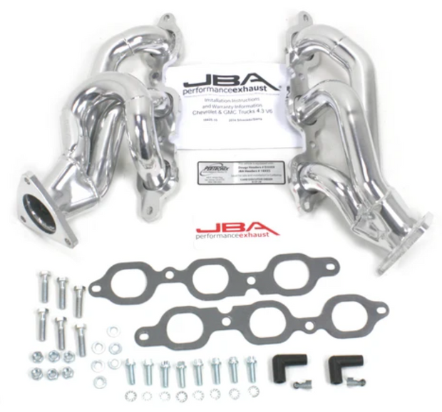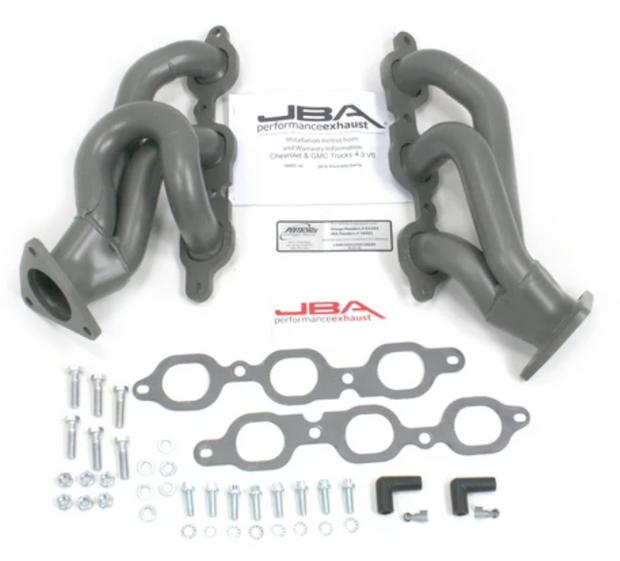 JBA shorty headers are one of the best performance upgrades available for any application. Hot Rod magazine rated headers as one of the top 10 power parts installed on a vehicle. JBA shorty headers are significantly less restrictive than the stock manifolds on a vehicle and dramatically increase the power and efficiency of an engine. JBA's original shorty design is an innovation of the old long tube header. The new shorty designs yield high performance gains that hot rodders and enthusiasts look for. With durable stainless steel construction that can survive the abuse of racing, towing, and daily driving, these headers can take a beating. With heavy duty features and proprietary technology, like the JBA Firecone collector JBA shorty headers have the capacity to produce more power than any other shorty headers on the market. Each system includes high quality hardware and thorough instructions for a professional no-leak installation. 1. Mandrel-bent stainless steel primary tubes- Best flow, durability, improved throttle response 2. Proprietary JBA Firecone collector- Race proven technology for maximum hp/tq gains 3. Factory style emission connections- Easier installation 4. Extra thick collector domes- Will not distort like lesser quality headers, no leaks 5. JBA Badge-Authentic JBA Quality 6. 3/8" thick machined flanges- Resists warping, prevents leaks, & easier install 7. Oversized exhaust ports- Increased flow, accommodates cylinder head porting 8. Available with two optional coatings polished metallic ceramic, titanium ceramic-increased corrosion protection, thermal barrier for lower underhood temperatures