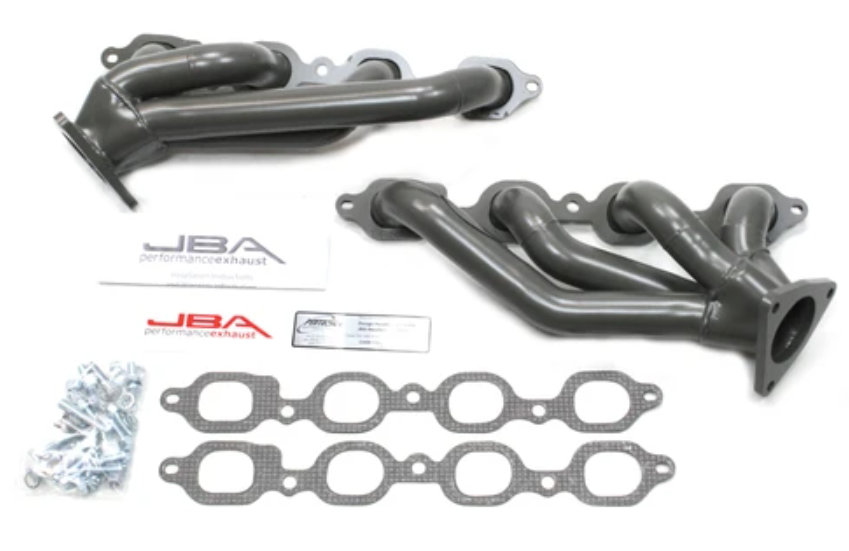 JBA shorty headers are one of the best performance upgrades available for any application. Hot Rod magazine rated headers as one of the top 10 power parts installed on a vehicle. JBA shorty headers are significantly less restrictive than the stock manifolds on a vehicle and dramatically increase the power and efficiency of an engine. JBA's original shorty design is an innovation of the old long tube header. The new shorty designs yield high performance gains that hot rodders and enthusiasts look for. With durable stainless steel construction that can survive the abuse of racing, towing, and daily driving, these headers can take a beating. With heavy duty features and proprietary technology, like the JBA Firecone collector JBA shorty headers have the capacity to produce more power than any other shorty headers on the market. Each system includes high quality hardware and thorough instructions for a professional no-leak installation. 1. Mandrel-bent stainless steel primary tubes- Best flow, durability, improved throttle response 2. Proprietary JBA Firecone collector- Race proven technology for maximum hp/tq gains 3. Factory style emission connections- Easier installation 4. Extra thick collector domes- Will not distort like lesser quality headers, no leaks 5. JBA Badge-Authentic JBA Quality 6. 3/8" thick machined flanges- Resists warping, prevents leaks, & easier install 7. Oversized exhaust ports- Increased flow, accommodates cylinder head porting 8. Available with two optional coatings polished metallic ceramic, titanium ceramic-increased corrosion protection, thermal barrier for lower underhood temperatures