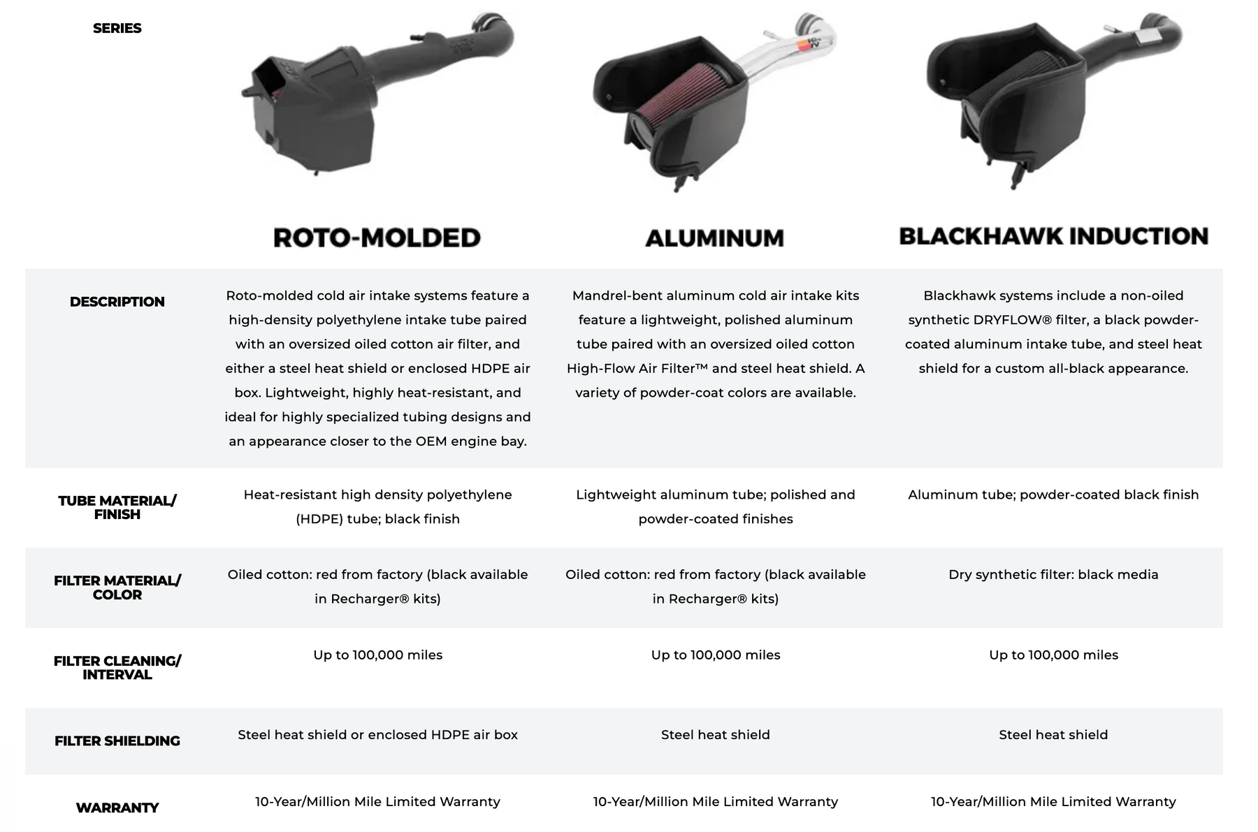 - Mandrel-bent aluminum intake tube paired with oversized oiled cotton air filter