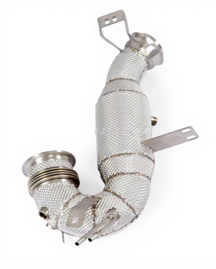 Crafted from 304 grade premium stainless this exhaust Down Pipe offers advanced airflow and performance gains over the factory setup. Manufactured using the latest in TIG welding technology, this Down Pipe deletes the restrictive catalyst delivering an average power increase of 20+ HP. This set also includes a heat wrap layer around the steel walls to protect against long term corrosion.