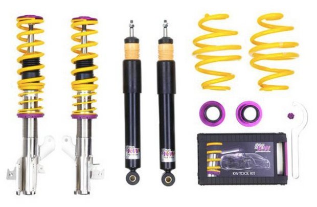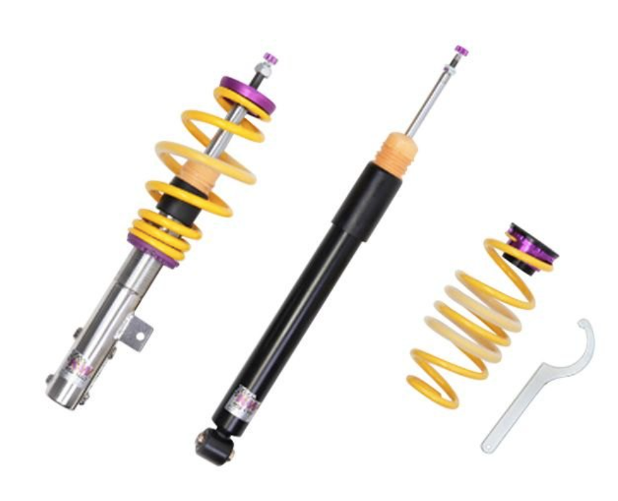The KW Variant 2 "inox-line" coilovers are the perfect solution for drivers who want more than just outstanding looks and adjustable ride height. In addition to the stainless steel coilover struts, and corrosion-resistant components built for long term durability, the KW Variant 2 coilovers give you the ability to adjust the rebound damping characteristics with 16 clicks of adjustment allowing the fine tuning of the ride comfort or performance to their satisfaction.