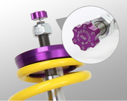 Similar to the KW Competition suspension used in international motorsports, the KW 3-Way Clubsport coilover kit allows fine tuning of the compression damping separately in the low-speed and high-speed range. The click adjustments of the TVCLH-A valve technology make for easy adjustment directly on the reservoir. You can modify the low-speed compression damping with 6 precise clicks with the purple low speed adjustment dial and directly beneath it the golden adjustment wheel provides an additional 14 precise clicks of high speed compression adjustment. In addition, the TVR-A technology provides 16 clicks to noticeably adjust the rebound damping independently of the compression damping. If you would like to adjust the KW 3-Way Clubsport coilover kit it can easily be adjusted for more comfort or to an alternative setup for a new race track. The KW 3-Way Clubsport benefits from the same motorsports technology that has proven its endurance with multiple overall wins at the ADAC Zurich 24h Nürburgring race.