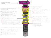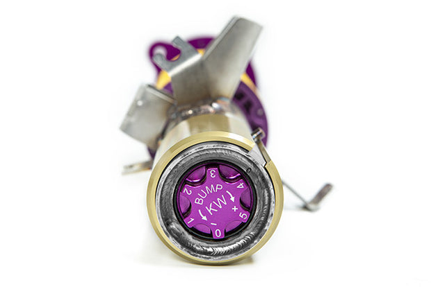 Similar to the KW Competition suspension used in international motorsports, the KW 3-Way Clubsport coilover kit allows fine tuning of the compression damping separately in the low-speed and high-speed range. The click adjustments of the TVCLH-A valve technology make for easy adjustment directly on the reservoir. You can modify the low-speed compression damping with 6 precise clicks with the purple low speed adjustment dial and directly beneath it the golden adjustment wheel provides an additional 14 precise clicks of high speed compression adjustment. In addition, the TVR-A technology provides 16 clicks to noticeably adjust the rebound damping independently of the compression damping. If you would like to adjust the KW 3-Way Clubsport coilover kit it can easily be adjusted for more comfort or to an alternative setup for a new race track. The KW 3-Way Clubsport benefits from the same motorsports technology that has proven its endurance with multiple overall wins at the ADAC Zurich 24h Nürburgring race.