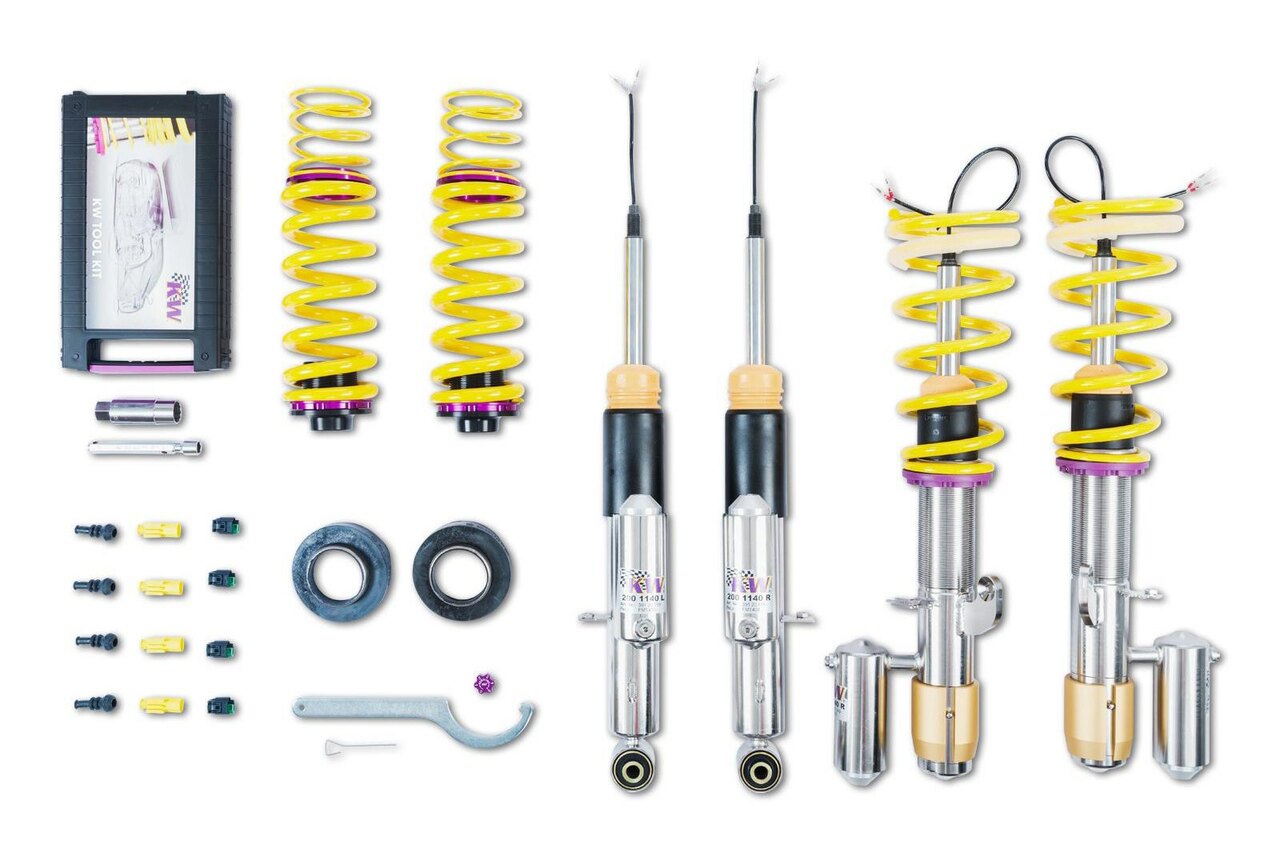 Using the Nordschleife as the testing grounds and data collected from our KW 7-post Driving Dynamic Test Center, KW developed it's 3-way Clubsport coilover kit. Wheel loads, vehicle weight and chassis reinforcements (increased body stiffness) can all be taken into consideration with the TVR-A & TVCLH-A valve technology and adjustment capabilities of the 3-way Clubsport. Similar to KW Competition 3-way coilovers, low-speed and high-speed compression adjustment is achieved by utilizing with the controls on the external reservoir.