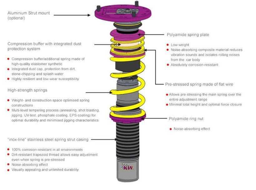 Our KW stainless steel alloy "inox-line" coilovers are built to stand for many years of driving pleasure