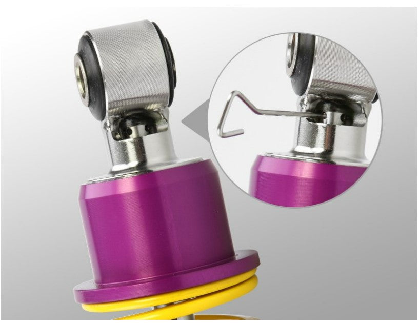 By hand, you can tune the low-speed compression damping with six precise clicks on the purple adjustment dial. The gold adjustment dial allows the user to change the high-speed compression damping with 14 precise clicks. Rebound adjustment is provided with 16 clicks, each providing a noticeable change. A reduction in rebound forces provides a more comfortable ride quality suitable for highway driving.