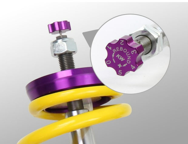 During tuning at the KW 7-post Driving Dynamic Test Center, the V4 coilover suspension is tuned so the preset recommended setting for best road performance is in the middle of the adjustment range with an additional recommended settings for the occasional track use. The 3-Way Clubsport coilover suspension is tuned with a preset recommended setting designed for track day use, with an additional recommended setting for the normal highway use. Starting from the factory setting, the damping can be set harder or softer in both the low and high speed ranges. The TVCLH-A technology has a blow-off feature with large cross-sections which allows for a substantial low-speed forces to provide optimum support of the vehicle body without unsettling the body in the case of sudden high damper stimulation induced by the wheels, like driving over apex curbing. The separate low and high-speed settings are always supplied with an additional rebound setting utilizing TVR-A technology for a truly independent 3-way damper setup.