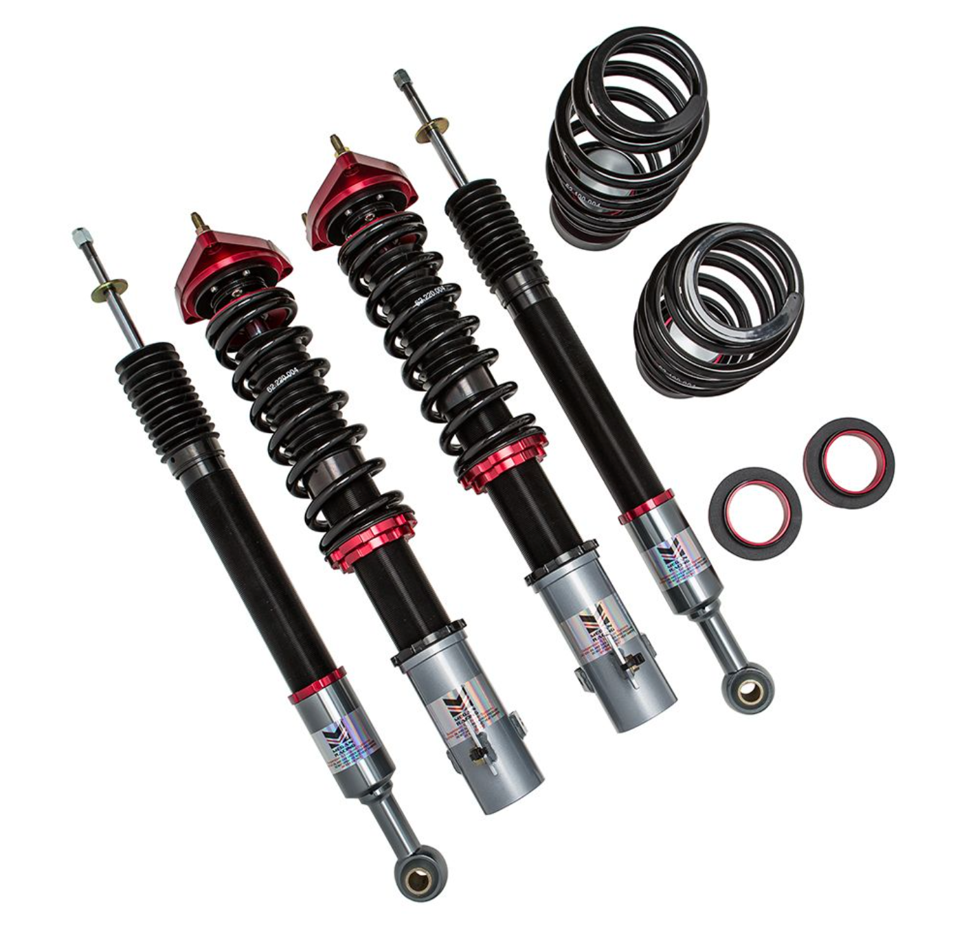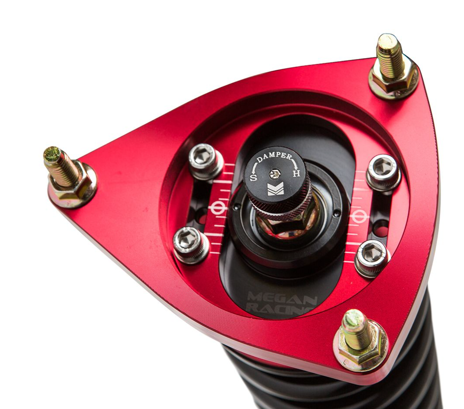 Megan Racing Coil Over Dampers are the ultimate upgrade to your track or street car. Featuring 32 levels of damper force adjustment, camber adjustable pillowball front top mounts and shock length adjustment allowing you to retain full suspension stroke and to fine tune your suspension characteristics. Compression and rebound settings are easily adjusted through a single damper adjustment knob which is built-in at the top of the damper mount for easy access. Adjustments are simple to tune according to your style of driving and desired comfort level whether you are a professional certified mechanic or an automotive enthusiast with amateur mechanical skills.