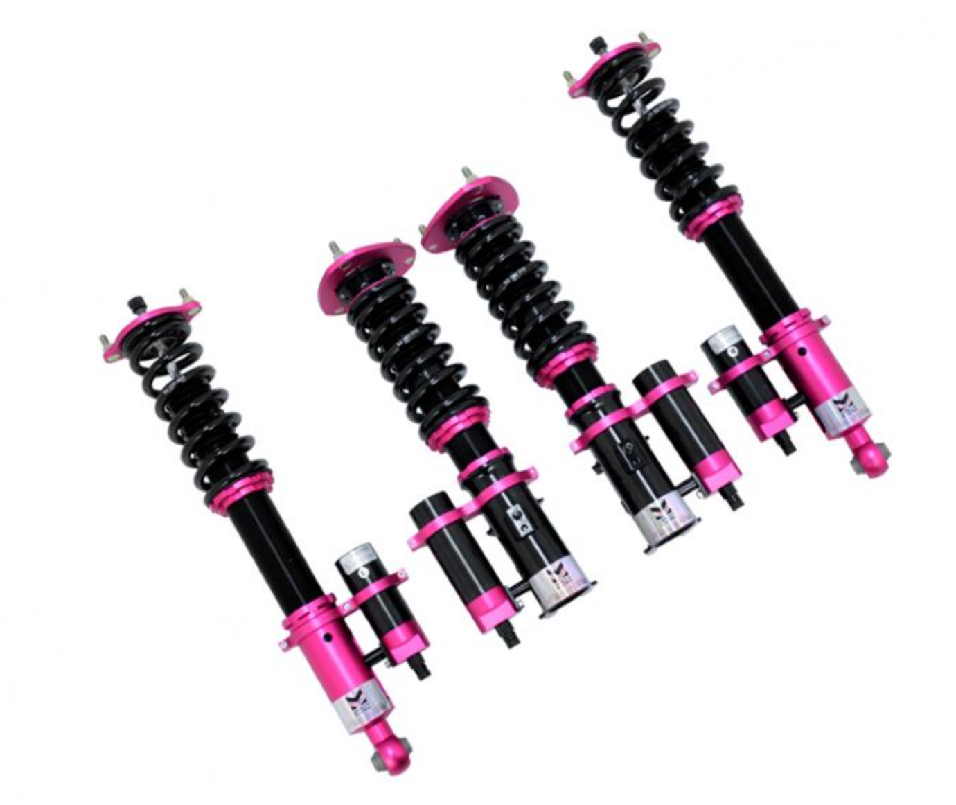 Height adjustments are made with separate CNC-Machined locking spring perches for accuracy and smooth adjustment with separate damper shock length adjustment to retain full-stroke and allows for precision suspension tuning. The wide range of allowable ride-height adjustment allows you to drop your car all the way down for an aggressive stance, or fine tune your suspension for the race-track to lowering your center of gravity to gain full potential of your vehicle's handling capabilities.