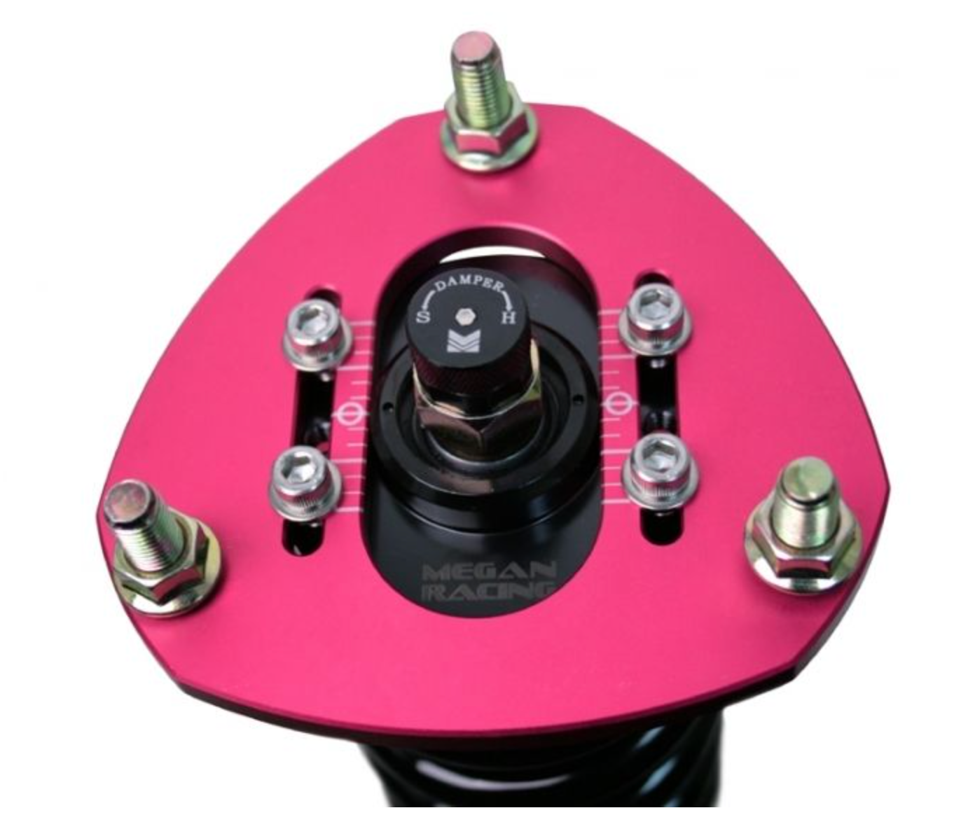 On applications utilizing strut-type suspension designs, the Megan Racing SPEC-RS Coil-over Damper Kits come with fully adjustable Pillow-Ball upper mount camber plates to easily tune and adjust your camber, giving you a competitive edge over other suspension setups. This allows you to tune your car for any ride height and still adjust camber to improve handling, vehicle predictability and tire wear, which is a great benefit both on the race-track and on the street.