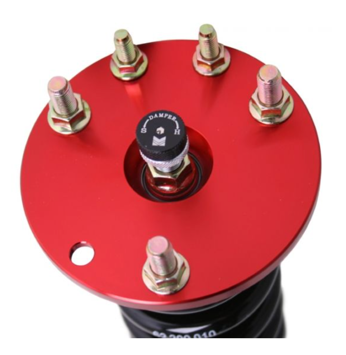 Height adjustments are made with separate CNC Machined locking spring perches for accuracy and smooth adjustment with separate damper shock length adjustment to retain full-stroke and allows for precision suspension tuning. The wide range of allowable ride height adjustment allows for a conservative drop to more aggressive ride heights for an aggressive stance, or to fine tune your suspension for the circuit to gain full potential of your vehicle's handling capabilities.