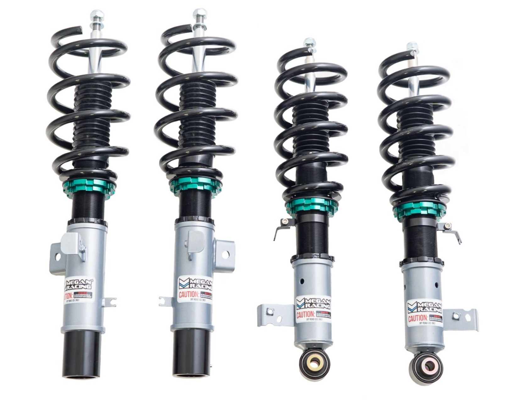 Megan Racing EU Series Suspension Systems are fully adjustable coilover systems which do not break the bank. With it's full length adjustable design, the vehicle's ride height can be adjusted without affecting the shock stroke ensuring a retained ride quality at nearly any height. Monotube internal shock construction separates the oil and hi pressured Nitrogen gas chamber preventing aeration. This allows for immediate shock response and damping consistency. 30-click damping force adjustability will also allow the user to fine tune the ride stiffness and response to his or her preference.