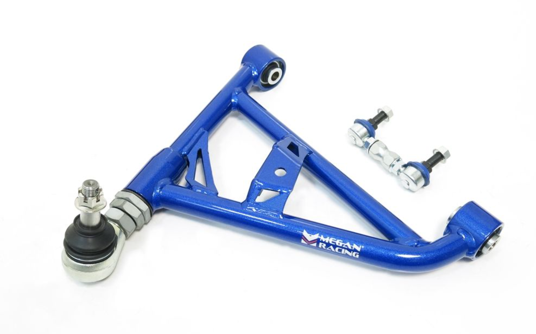 Megan Racing control arms are constructed of high-strength steel offer durability and strength while reducing weight. Spherical bushings eliminates suspension movement over molded rubber bushings while allowing for freedom of movement without binding. All arms are also protected with a 1-year warranty against manufacturer defects.