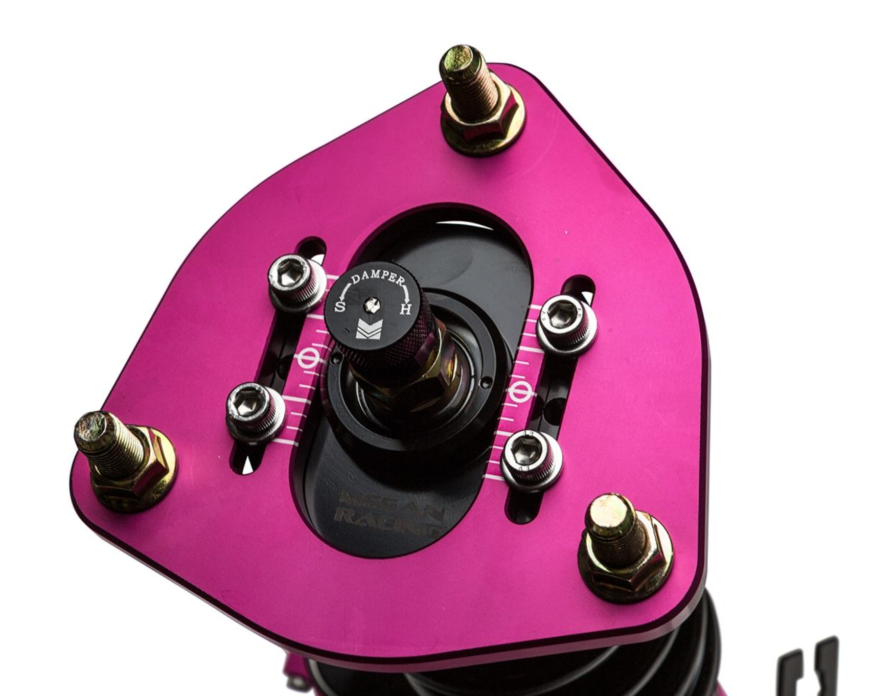 On applications utilizing strut-type suspension designs, the Megan Racing SPEC-RS Coil-over Damper Kits come with fully adjustable Pillow-Ball upper mount camber plates to easily tune and adjust your camber, giving you a competitive edge over other suspension setups. This allows you to tune your car for any ride height and still adjust camber to improve handling, vehicle predictability and tire wear, which is a great benefit both on the race-track and on the street.