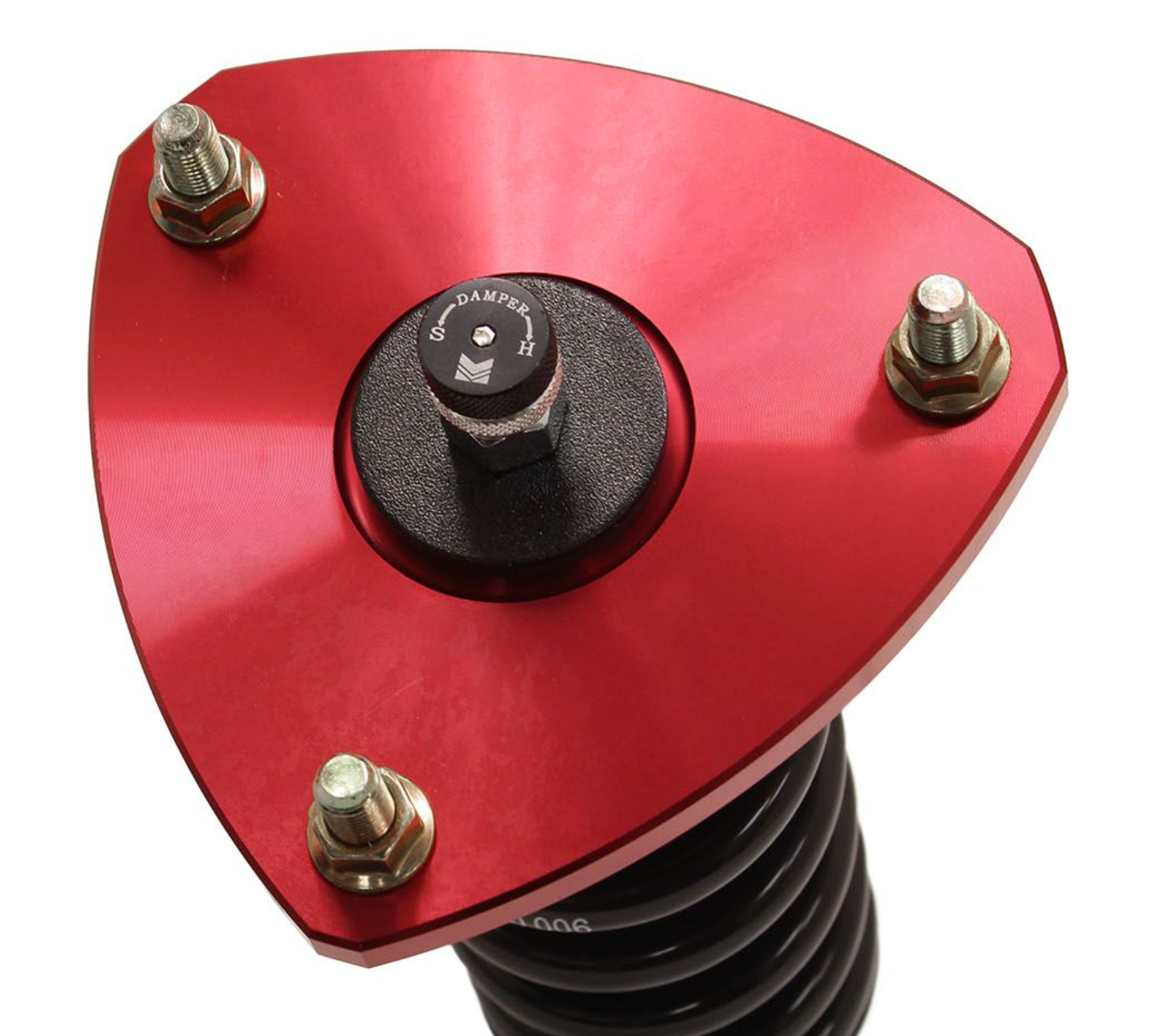 Height adjustments are made with separate CNC Machined locking spring perches for accuracy and smooth adjustment with separate damper shock length adjustment to retain full-stroke and allows for precision suspension tuning. The wide range of allowable ride height adjustment allows for a conservative drop to more aggressive ride heights for an aggressive stance, or to fine tune your suspension for the circuit to gain full potential of your vehicle's handling capabilities.