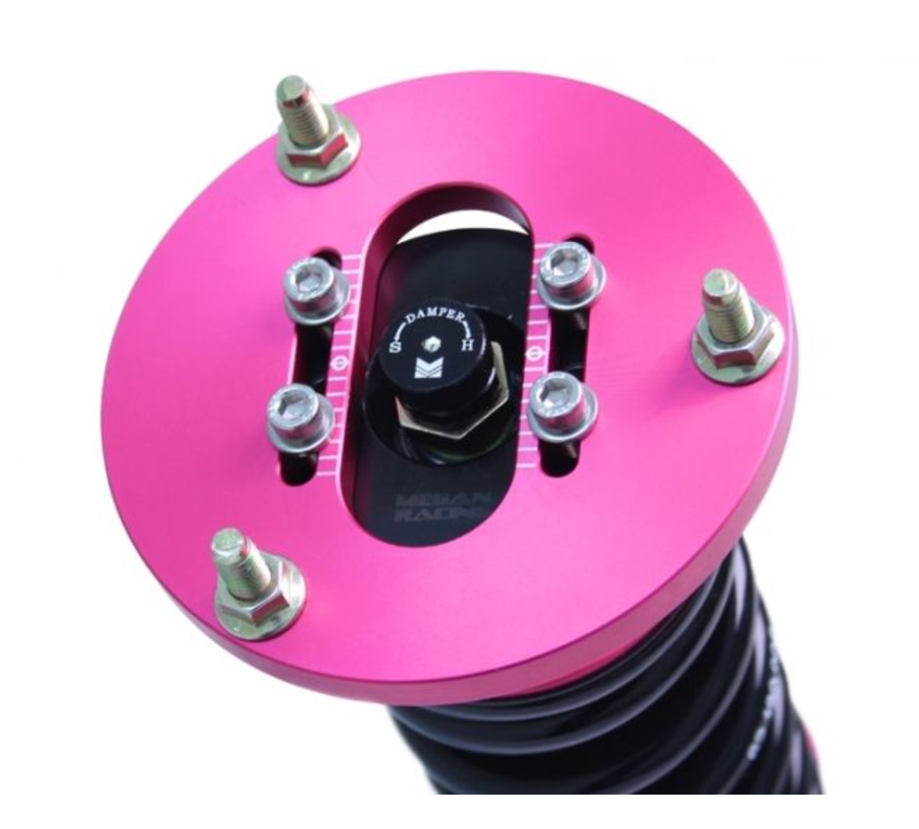 On applications utilizing strut-type suspension designs, the Megan Racing SPEC-RS Coil-over Damper Kits come with fully adjustable Pillow-Ball upper mount camber plates to easily tune and adjust your camber, giving you a competitive edge over other suspension setups. This allows you to tune your car for any ride height and still adjust camber to improve handling, vehicle predictability and tire wear, which is a great benefit both on the race-track and on the street.