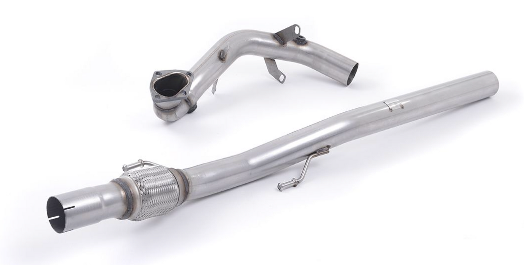 Milltek Sport Large-Bore Downpipes are perfect when looking to improve both performance and sound. These downpipes are fabricated with a larger diameter than standard OEM parts, meaning that there is significantly more space for more gas to exit the engine and pass through, increasing efficiency. Used with our Catalyst Bypass Pipe, you can expect significant power-gain without any restriction on gas-flow made by a catalyst.