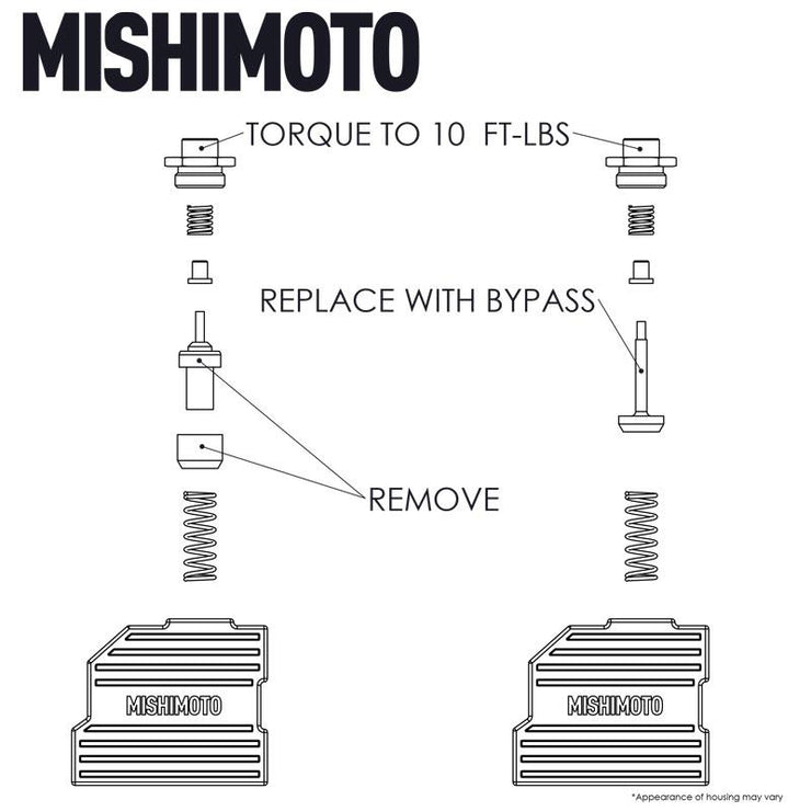 (1) CNC-Machined Billet Aluminum Thermal Bypass Valve--(1) Removable Thermostat--(1) Removable Thermostat Bypass w/ Installation Hardware--(1) Assembly Notecard--Mishimoto Lifetime Warranty