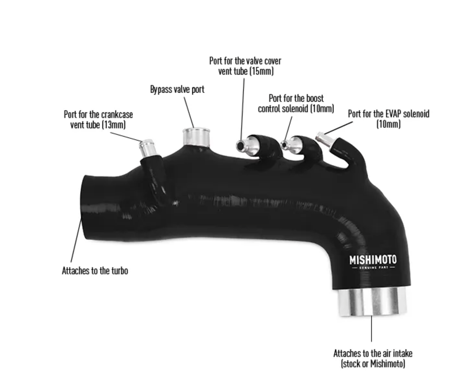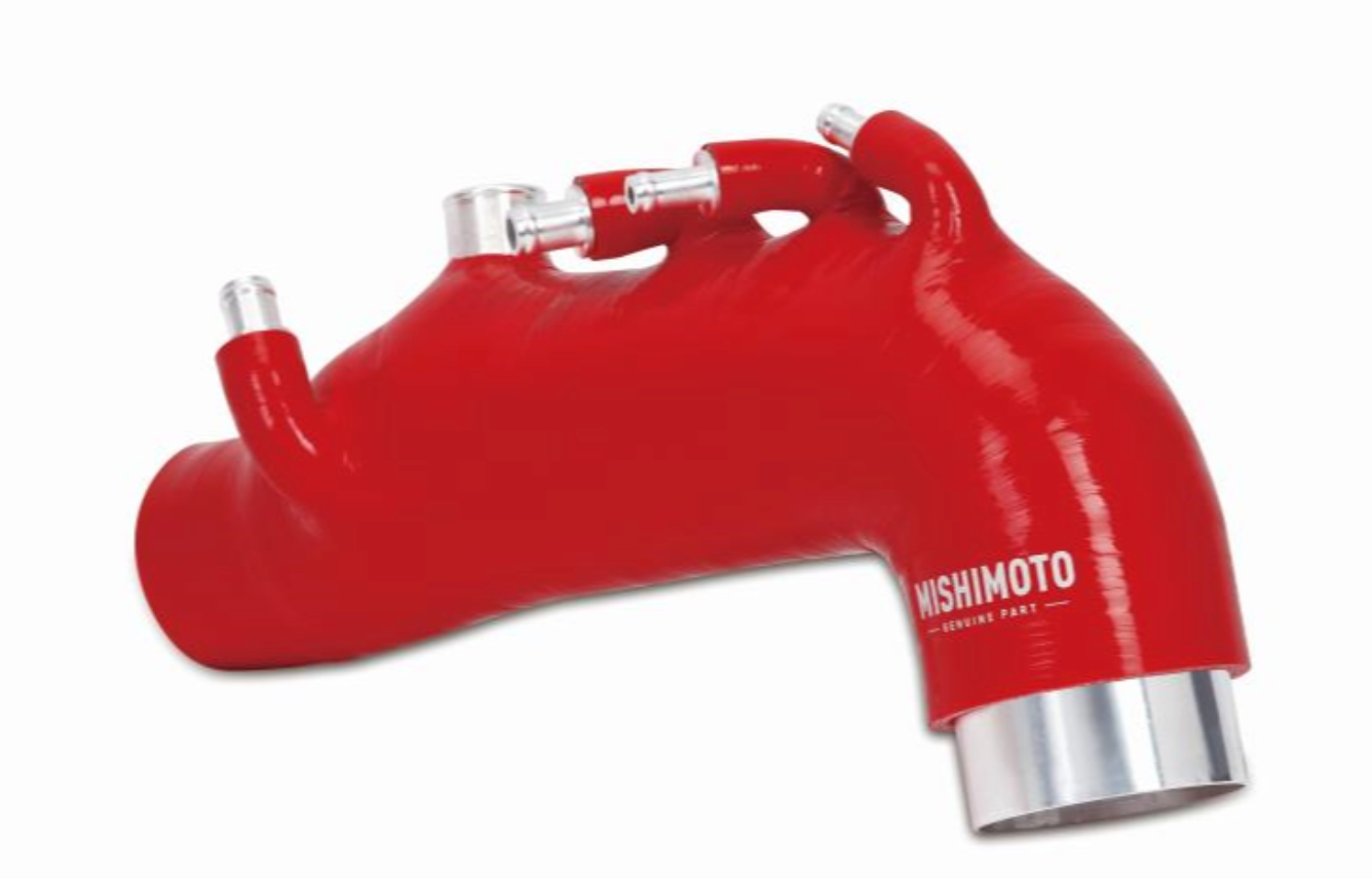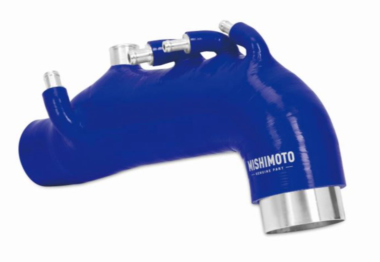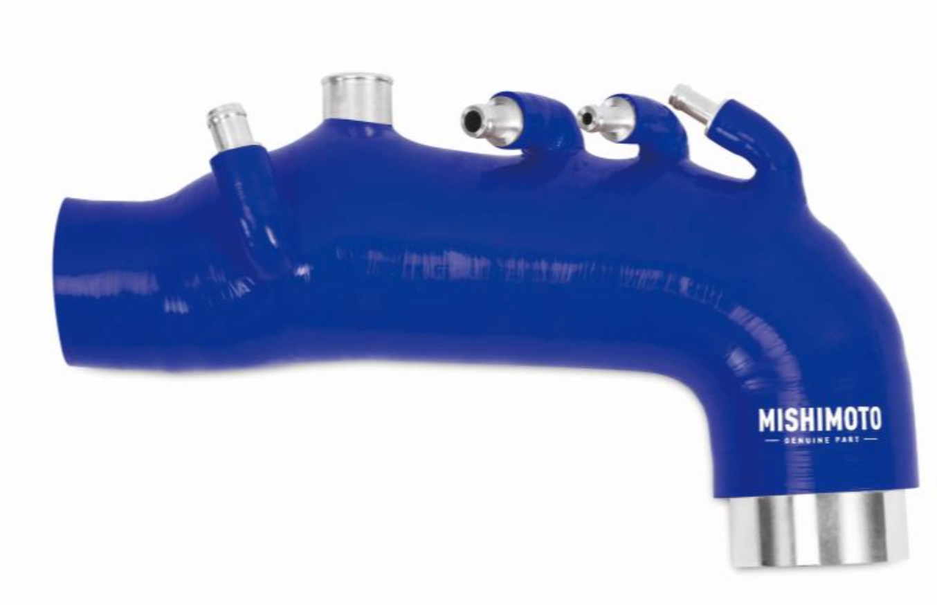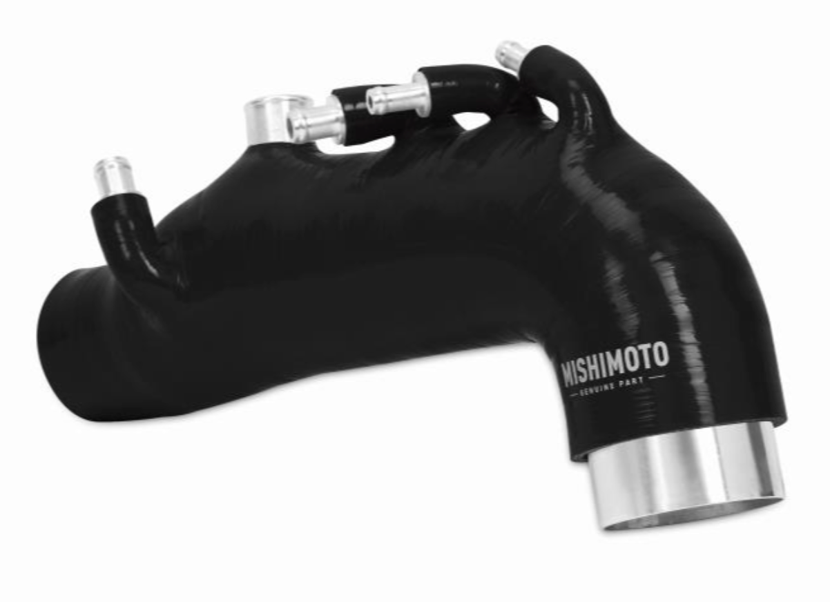 The Mishimoto WRX induction hose is wire reinforced to prevent collapsing under pressure and features increased flow thanks to a larger internal diameter. The accessory ports of this induction hose come with CNC aluminum fittings with a 3-barb design that will not fall out or leak under load. This turbo inlet hose also comes with everything you'll need for installation, including a robust 2.5" T-bolt clamp for the turbo as well as added worm-gear clamps.