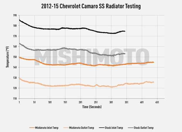 With all-aluminum end tanks, an almost 5mm thicker core, and 22% greater coolant capacity, we were confident that our radiator would significantly out-perform the stock unit. We were not disappointed. These LS3 and L99 Camaros tend to run hot, putting a lot of stress on the cooling system and their owners. With the stock radiator, we were seeing coolant temps averaging around 180°F at the radiator inlet. Our radiator lowered the inlet temperature by almost 40°F under the same conditions. The result is less stress on the engine, and your heart.