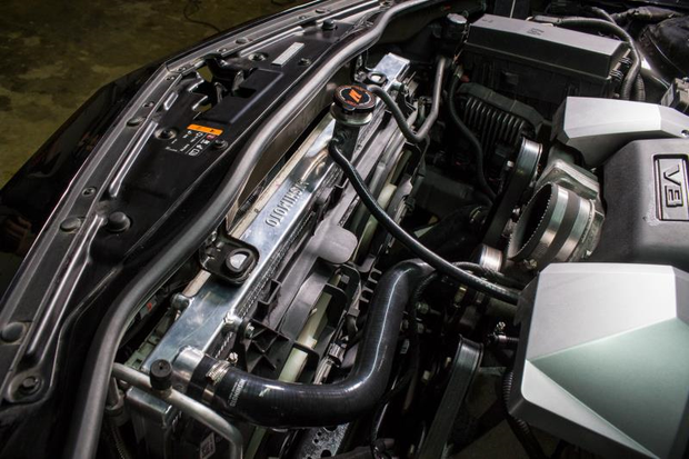 With the old radiator out, Jason was able to seamlessly slip the Mishimoto performance aluminum radiator in its place. While the original radiator looked pretty good for its age, it never hurts to have a little extra insurance with a fully aluminum design and thicker core, especially on such a powerful vehicle. Plus, we’re pretty happy with how the radiator looks in the engine bay.