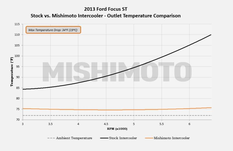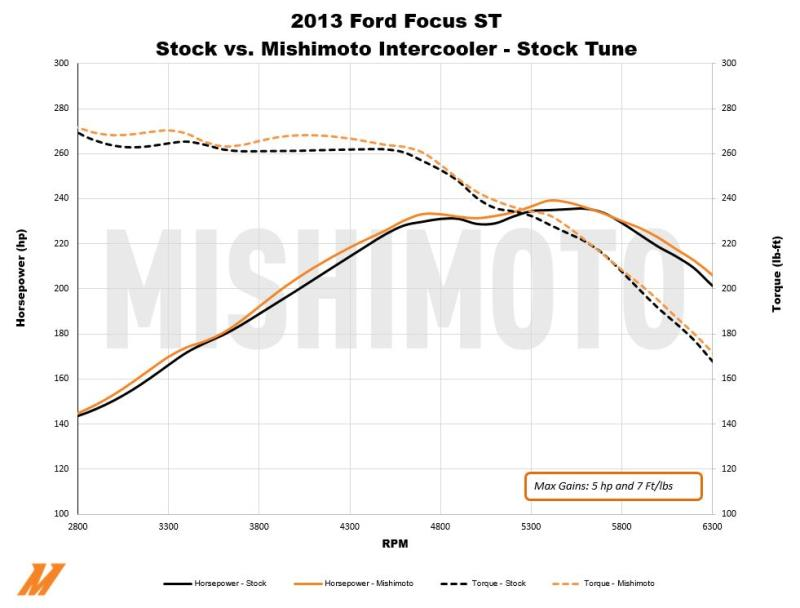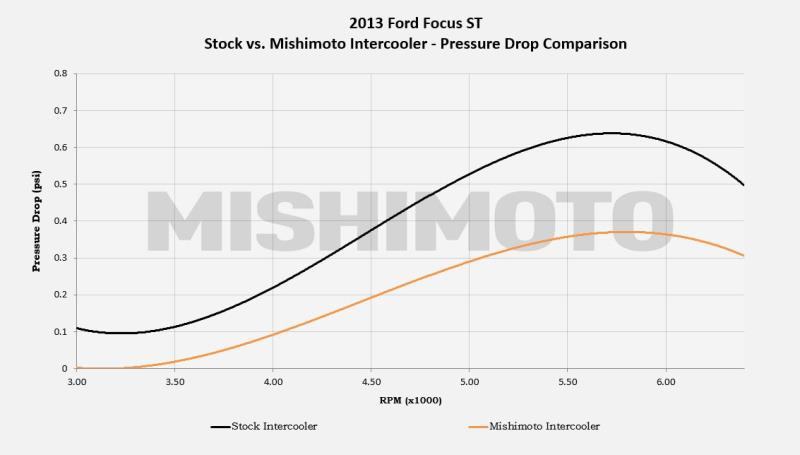 With our extensive line of Focus ST products, one more thing was needed to complete the Mishimoto arsenal – a performance intercooler upgrade. We’d like to introduce our 2013–2018 Ford Focus ST Performance Intercooler. This intercooler brings great performance, awesome looks, and increased airflow efficiency all in one neat package. Our intercooler drops outlet temperatures by 34°F through a core that is 128% bigger than stock, along with 32% more external fin surface area. When it comes to power, we saw consistent improvements of an extra 5 hp and 7 ft-lbs of torque over baseline.