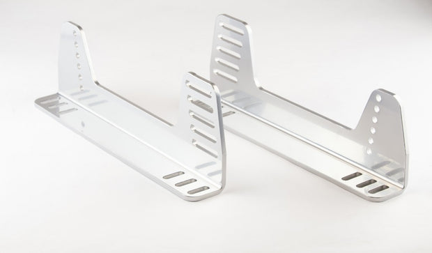 The Planted Side Mount is an "L" shaped bracket sold in pairs (left and right) used to install side mount seats. Side mount seats have the mounting holes on the side of the seat rather then the bottom so a Side Mount or similar product is required for installation. The Planted Aluminum 90 Degree Universal Side Mount is made from 1/4th inch thick aluminum which complies with FIA's required thickness, weighs approximately 3 lbs, and is powder coated grey. These will fit Side Mount Seats offered by most seat manufacturers and have been tested on Bride, Corbeau, Cobra, Momo, NRG, OMP, Ractech, Recaro, Sabelt, Sparco, Status Racing & Takata. The wider slots allow the Side Mounts to be compatible with most other seat manufacturers as well but we have not test fitted them all. The Side Mounts are made to bolt directly to sliders but have multiple slots for adjustability when direct mounting (eliminating sliders). 90 DEGREE VS OFFSET SIDE MOUNTS